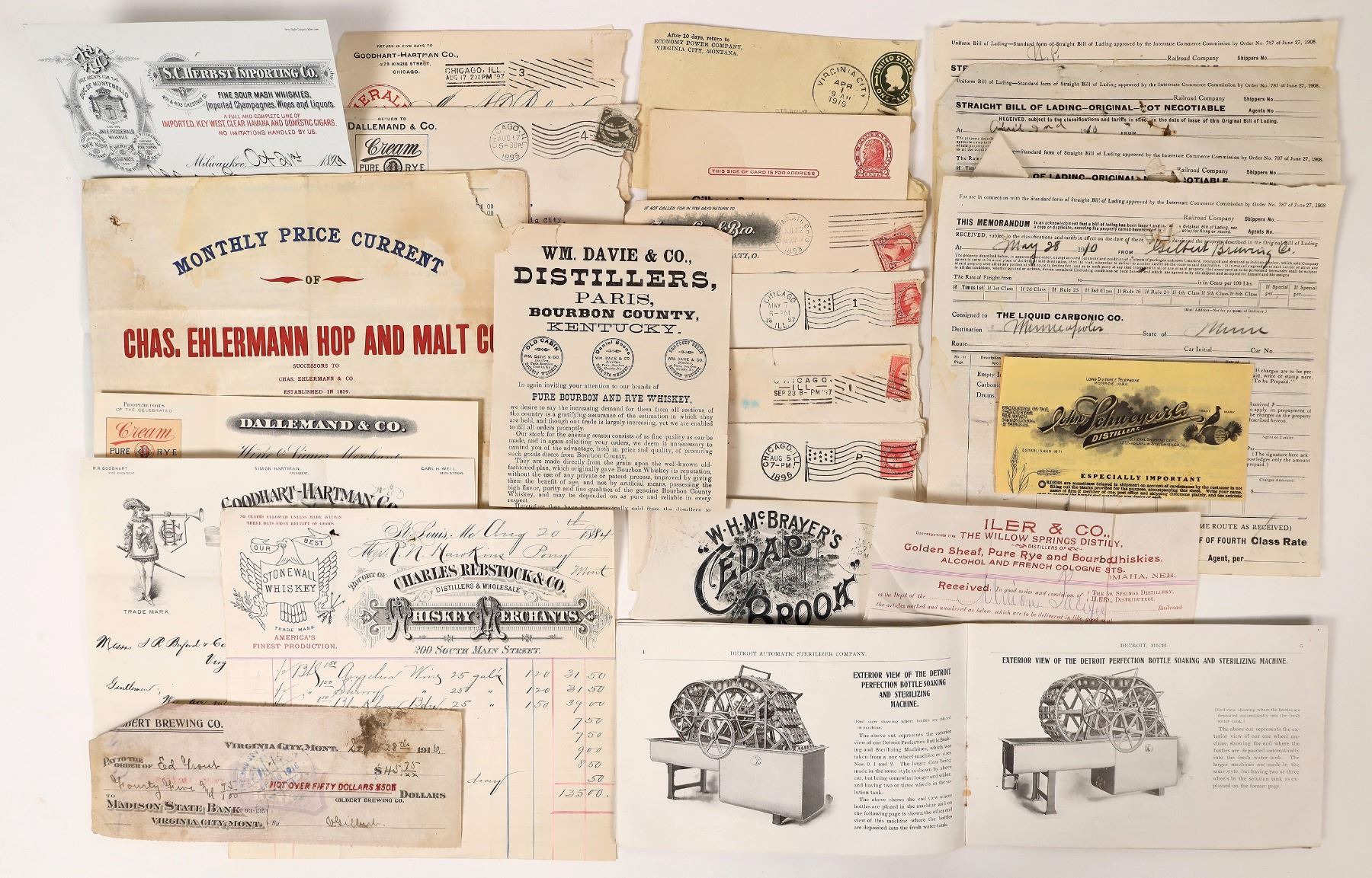 Lot of 25. Includes billheads, letterheads w/ accompanying covers, bills of lading, and more all mailed to/billed to Montana merchants. Includes: G. Cohn Co. pictorial letterhead, San Francisco, 1896; Goodhart-Hartman Co. pictorial billhead, Chicago, 1894; Dallemand & Co. letterhead, Chicago, 1897; Charles Rebstock & Co. billhead, St. Louis, 1884; price list for Chas. Ehlermann Hop & Malt Co.; Liquid Carbonic Co. bills of lading; James Levy & Bro. pictorial cover for Cedar Brook whiskey; an illustrated booklet for the Detroit Perfection Bottle Soaking & Sterilizing Machine; and more. Please inspect.