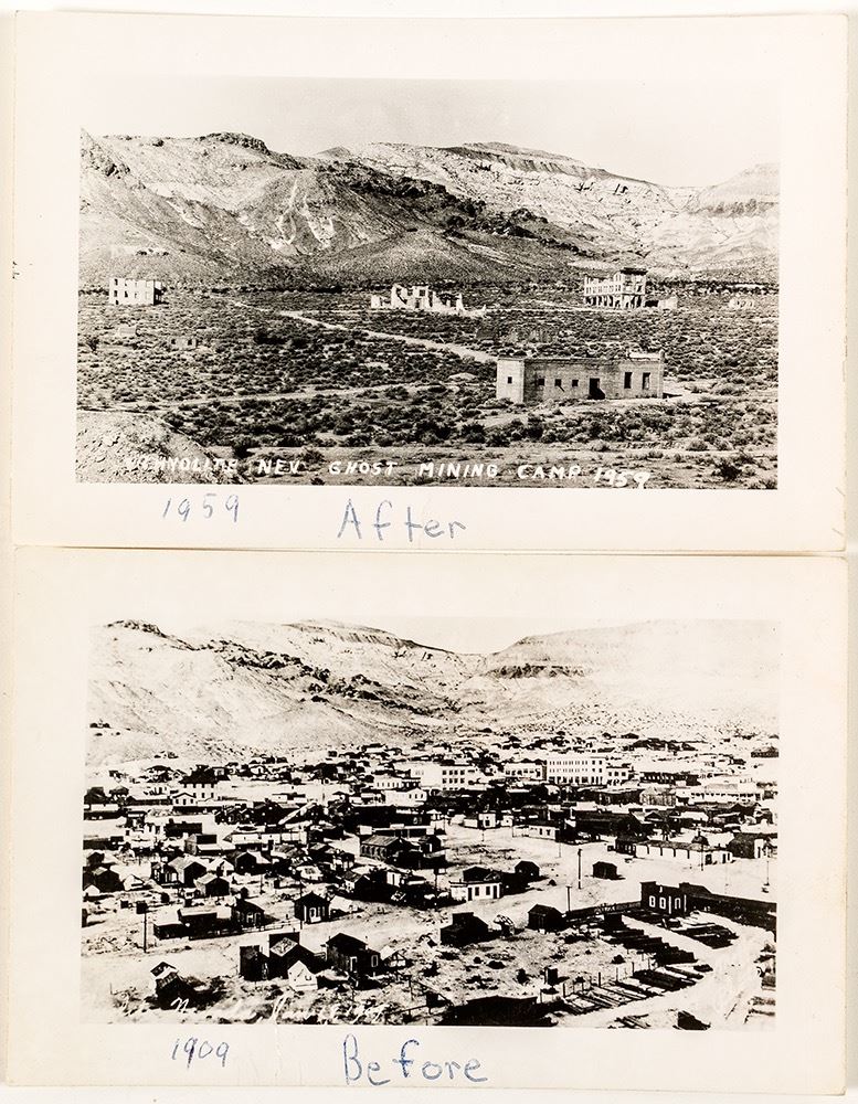 Two RPC's. One photo is from 1909 of Rhyolite as a booming mining town. The after photo taken in 1959 shows Rhyolite as a ghost mining camp. Great set! (Prag collection) City: Rhyolite State: Nevada Date: ID# 44630
