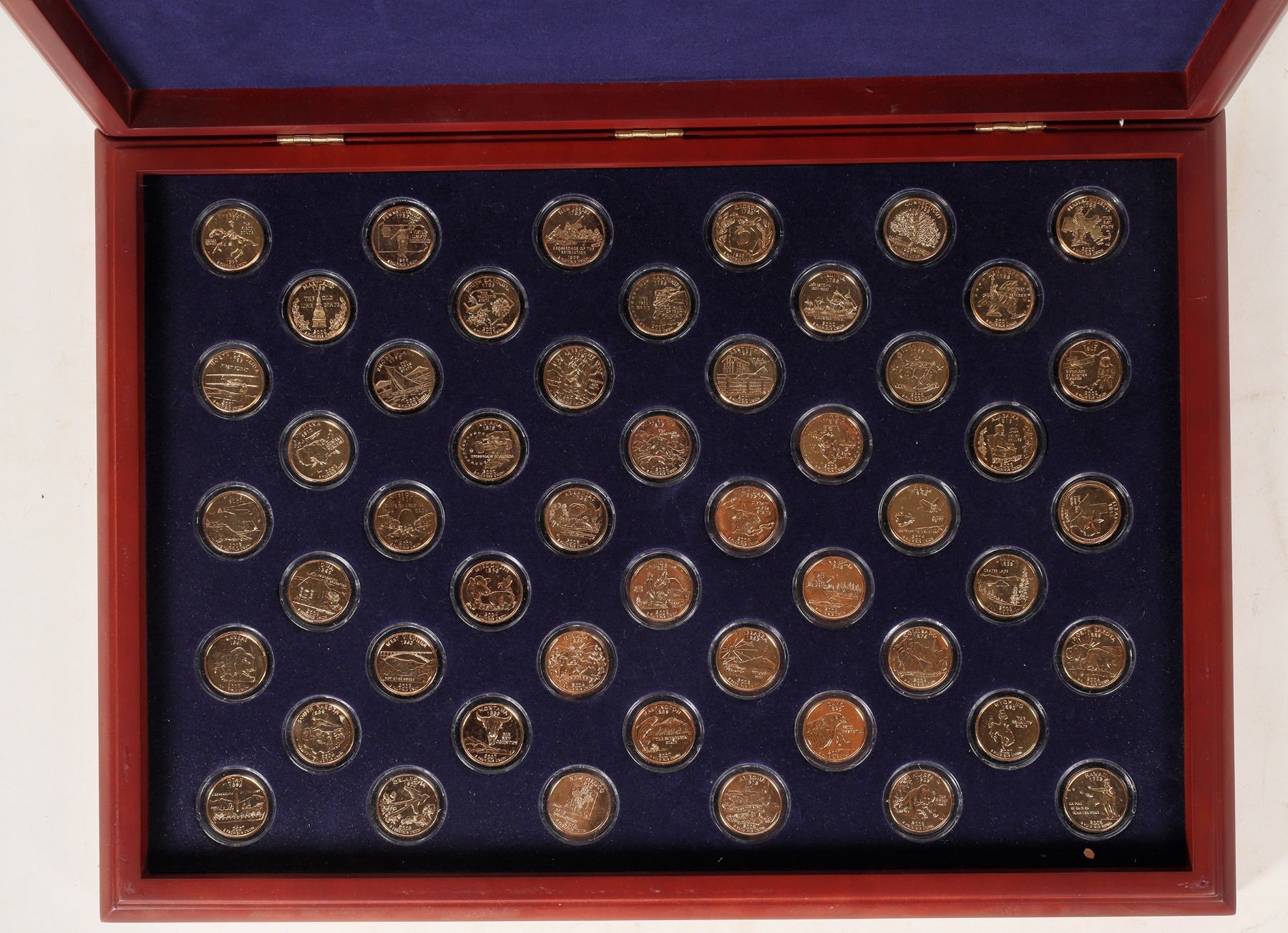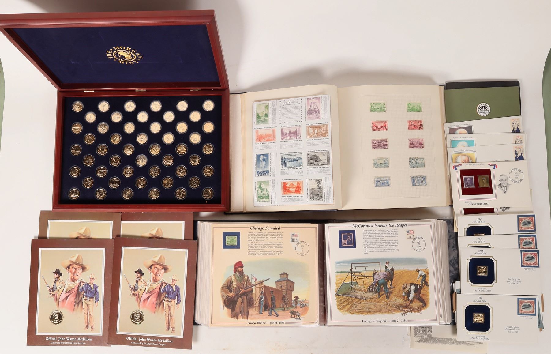 Stamps and coins to start a new hobby: 1) Wooden case from the Morgan Mint with 24 carat gold layered state quarters; all 50 states with brochure describing each state. 2) four Official John Wayne Medallions authorized by the United States Congress. 3) 14 First Day Covers. 4) Vintage stamp album, two inches thick, with U. S. singles and plate blocks, hinged, through about 1940, and foreign pages as well. Well over 1200 stamps. 5) The History of America in Stamps, by the Postal Commemorative Society, with 57 pages with stamps commemorating events in American History. Issued during the 1980s.