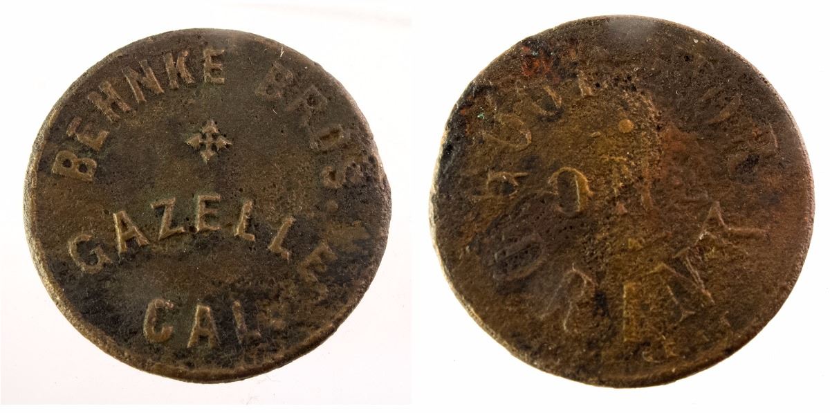 Siskiyou County. Good for one drink. Round, brass, worn but very readable. Please inspect. An exceptional California town. State: California City: Gazelle Date: FHWAC#: 43574