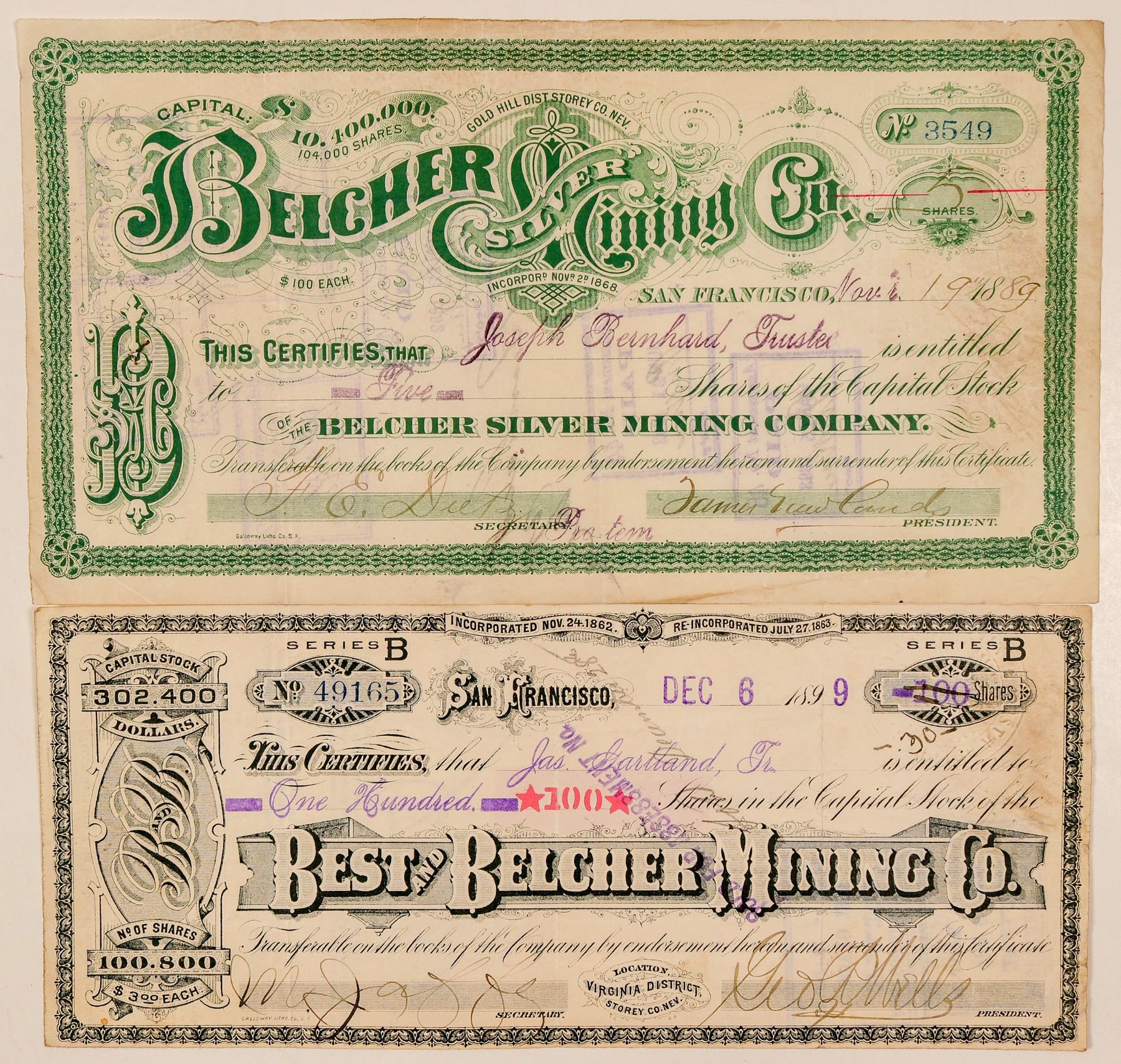 Lot of two from the "Belcher" Comstock mines. 1) Belcher Silver Mining Company. Gold Hill Dist., Storey Co. Nev. No. 3549, issued in 1889. Not cancelled. Green border and fancy logo. Pinholes, folds, creases, some soiling. Very productive Gold Hill mine; one the biggest producers on the Comstock. Staked in 1859. Site of the Crown Point-Belcher Bonanza. 2) Best & Belcher Mining Company. Location Virginia District, Storey Co. Nev. (printed at center bottom). Issued in 1899, stamped cancel. Folds, pinholes, soiling. Staked in 1859 between the Cons. Virginia and Gould & Curry. Never paid any dividends. Best & Belcher purchased the claim from Henry Comstock and sold it soon after. [Ref: Ansari] Ken Prag Collection