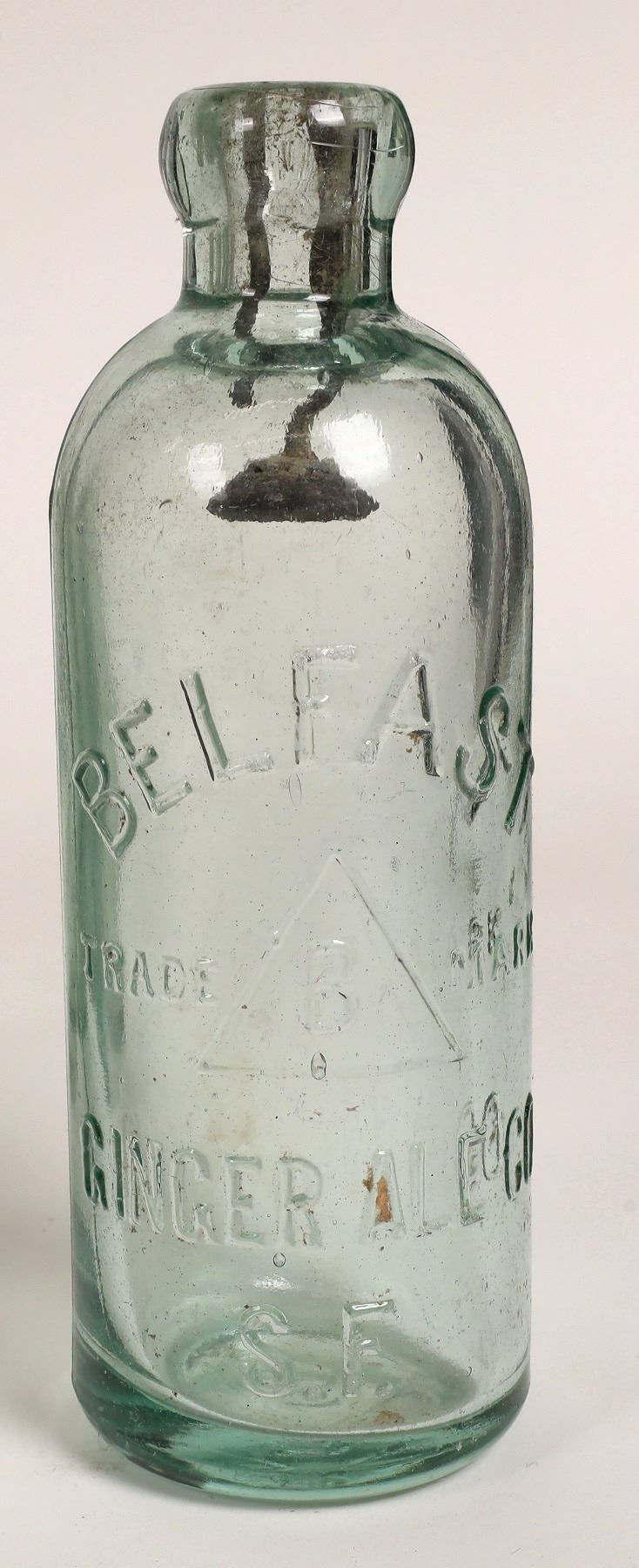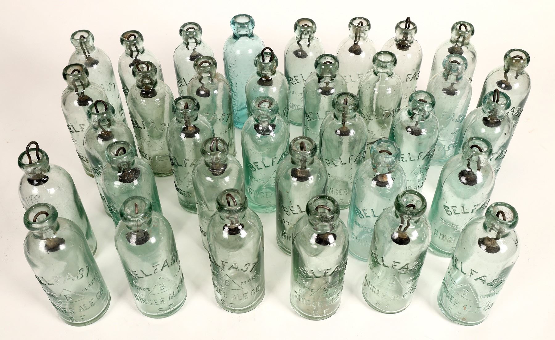 A group of 33 original belfast aqua hutch soda bottles found in the basement of the Nevada City Soda Works. These are entirely undug and generally mint. It was not uncommon to purchase the bottle stock from another soda works and place a paper label over the top of the embossing. This soda is found in Markota, p13, rated at $30-$70 each. As an original untouched group, it should be of great interest to collectors.. c1905. San Francisco California