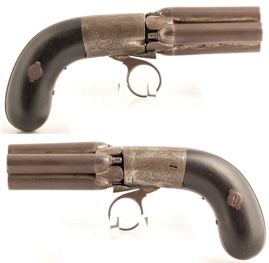 This is a .40 cal. Belgian Brevette double action pepperbox 4 barrel under-hammer revolver. c. 1830-1840's manufacture that needs mechanical work. Each barrel is marked 1-4 nicely engraved, ornate, with ebony grips and ring trigger. Marked St. Etiene. State: City: Date: ID# 49606