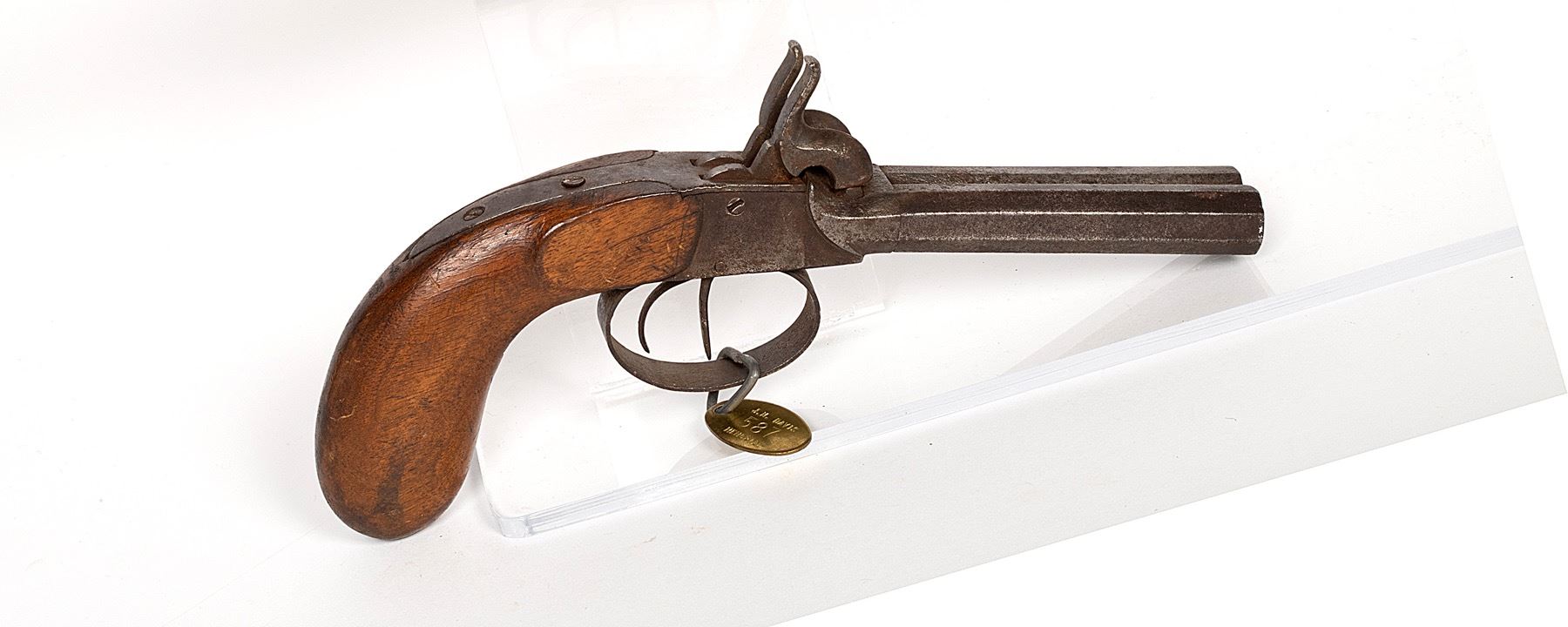Pistol, Belgian, Pocket Double barrel. 4Ó-barrel, dual hammer/trigger, wood grip, SN: N/A, JMD Oval Tag: 587, Condition: Good, >
