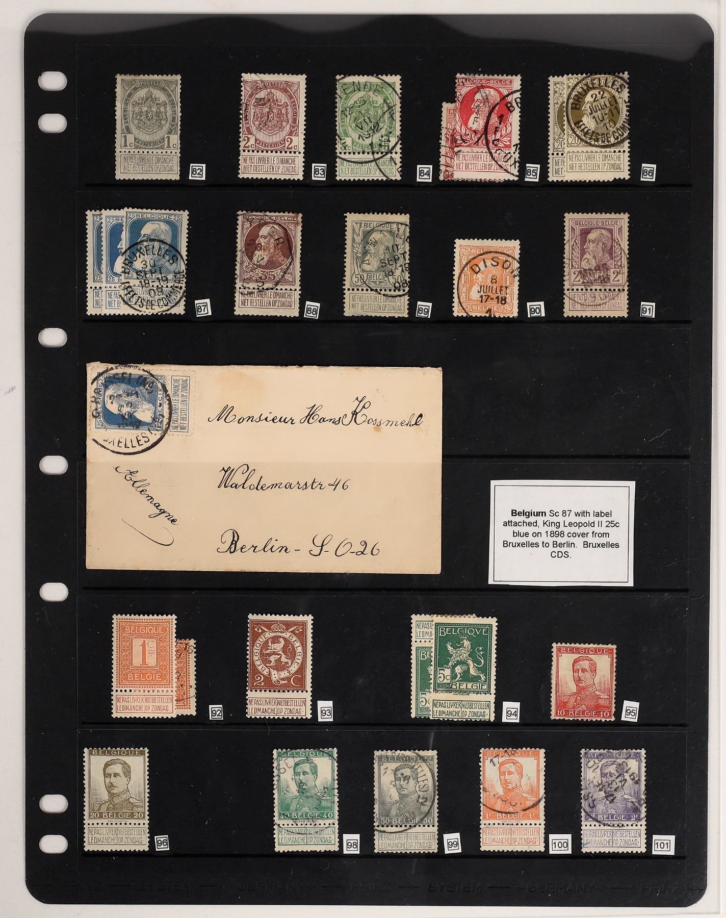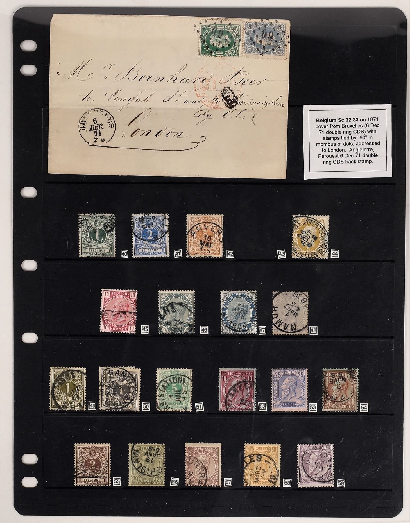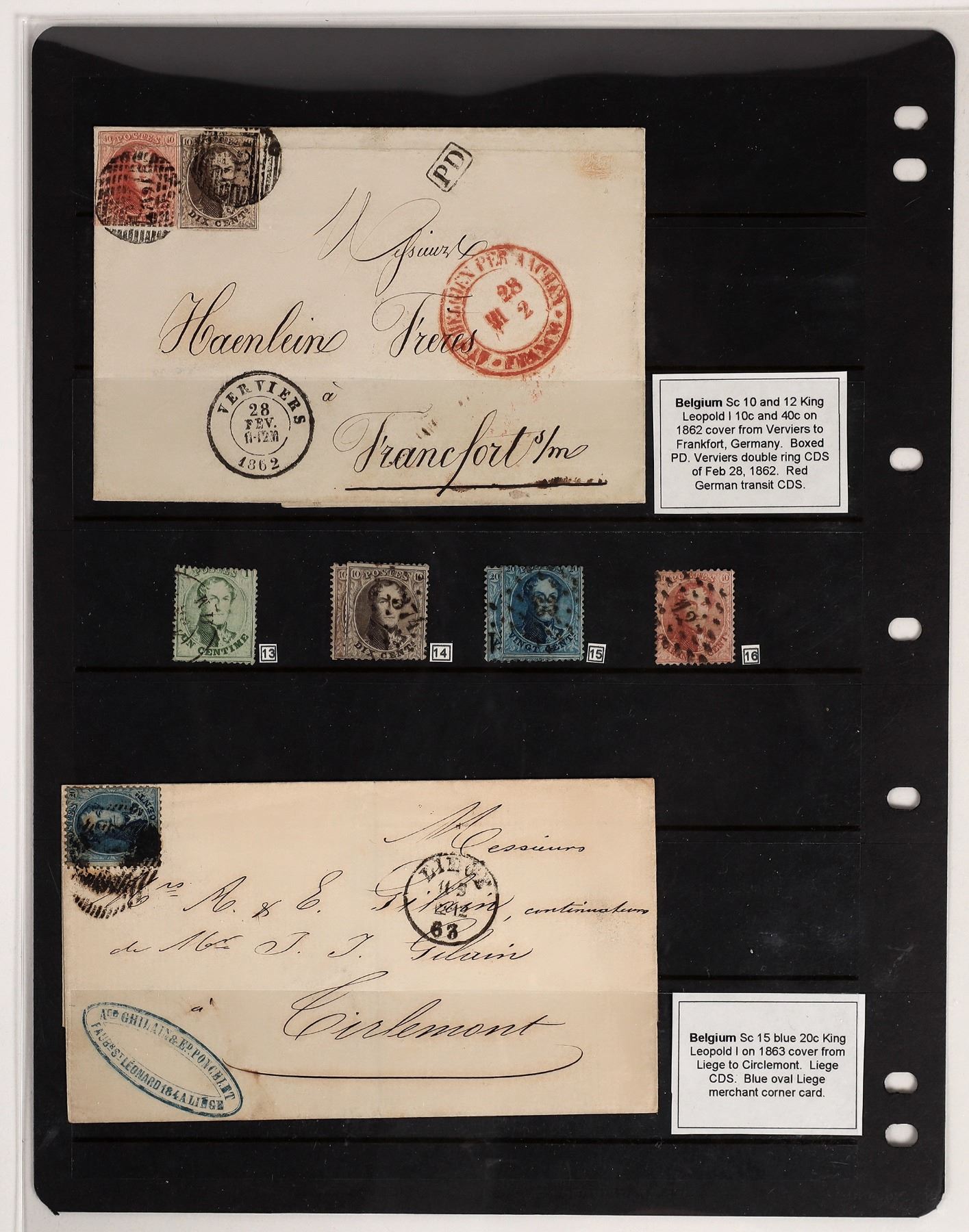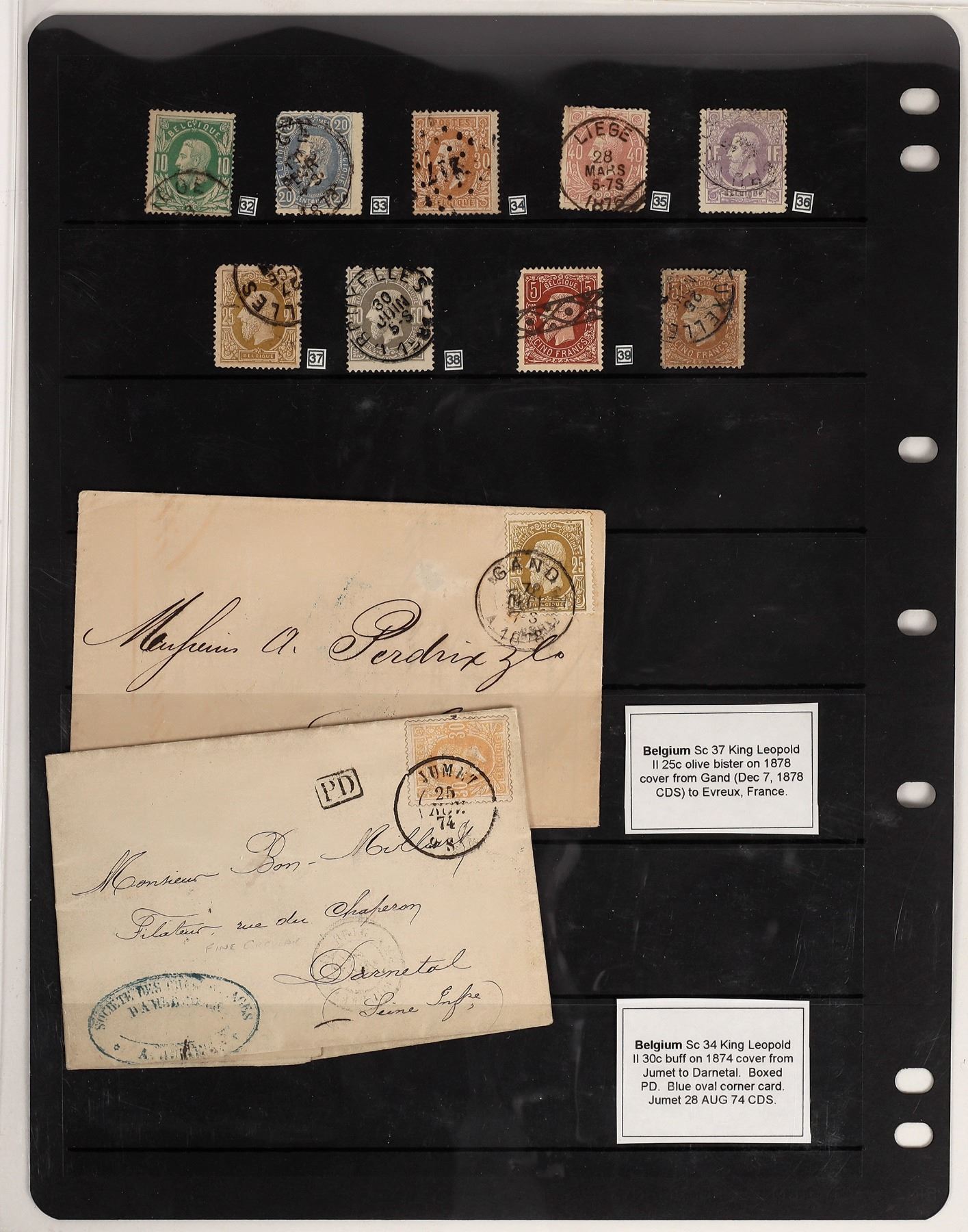 Belgium. 1850-1912 issues, comprehensive collection with Scott numbers #1-101 complete ex four (#23, 27, 43, 97), incl. 1878 5fr pale brown, owner's 2005 Scott catalog $3,540 (not counted 1875 5fr bar cancel with corner flaw), also 16 useful covers, best 1862 to Frankfort with 1861 40c & 10c, file fold affects stamps. Please see scans.
