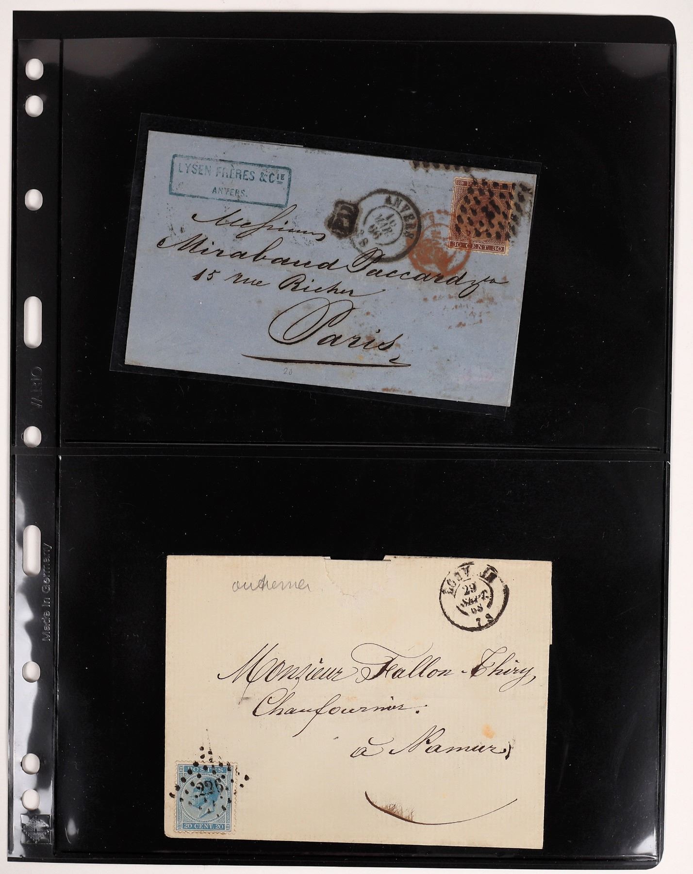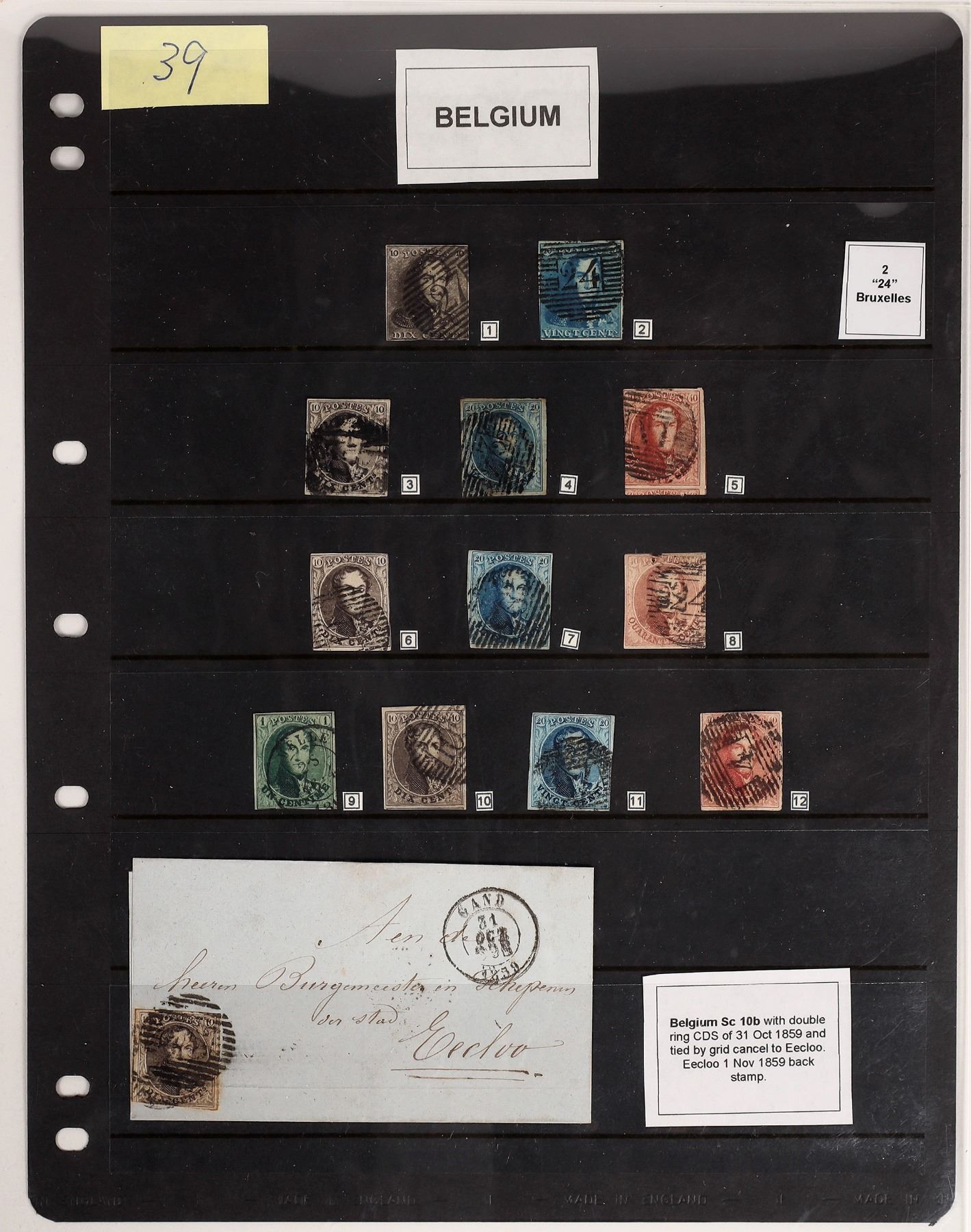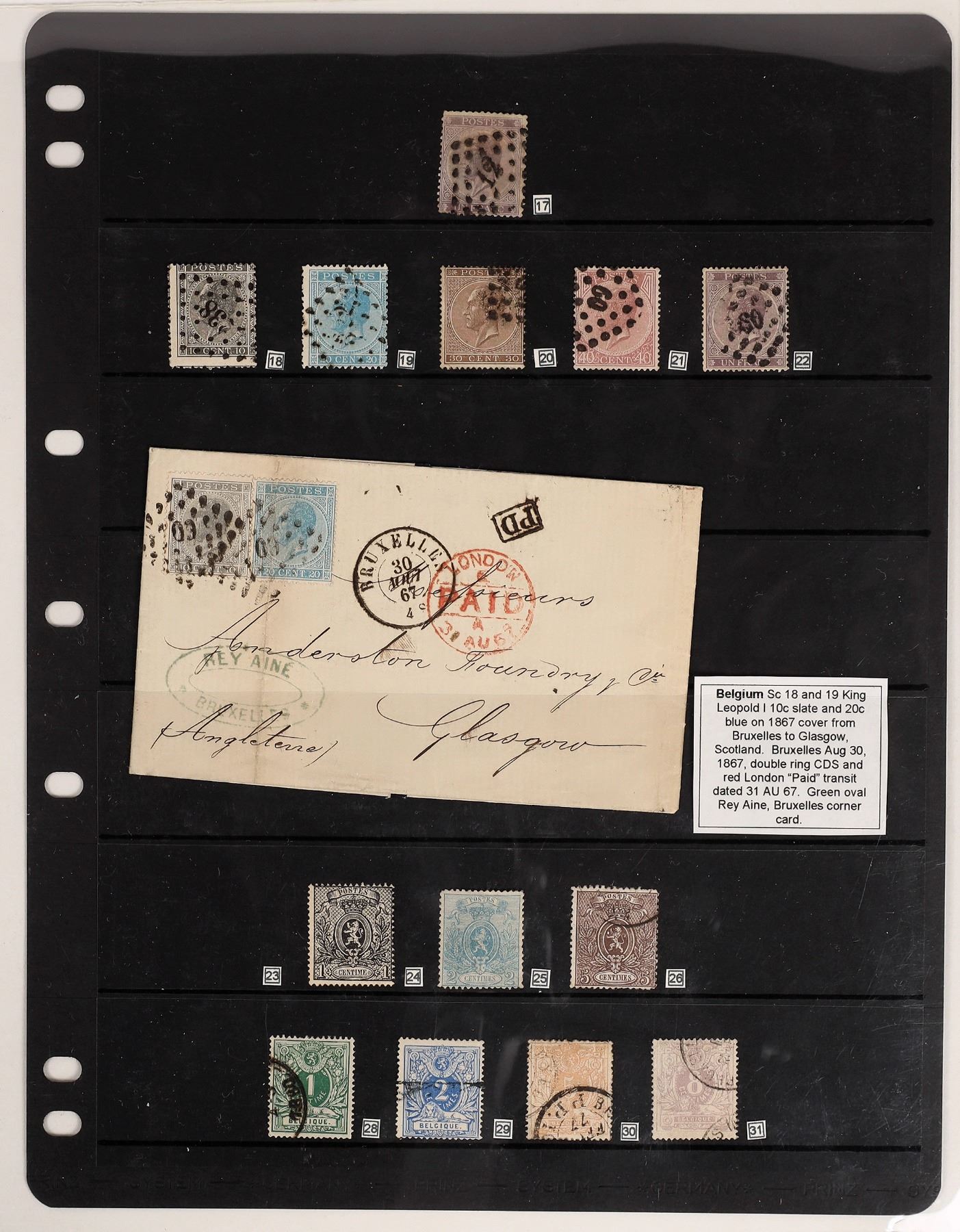 Belgium. 1850-1912 issues, comprehensive collection with Scott numbers #1-101 complete ex four (#23, 27, 43, 97), incl. 1878 5fr pale brown, owner's 2005 Scott catalog $3,540 (not counted 1875 5fr bar cancel with corner flaw), also 16 useful covers, best 1862 to Frankfort with 1861 40c & 10c, file fold affects stamps. Please see scans.