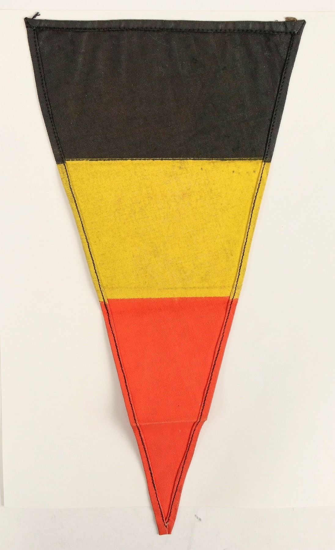 A 1940's era pennant from the country of Belgium. Pennant measures 12"x 6" (At its widest point). It has the colors of Belgium, black, yellow & orange which signifies of the heraldry of the Duke of Brabant. In decent condition. Please see photos for more details.[ Belgium