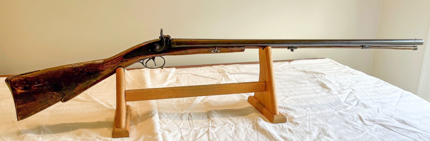 This side by side shotgun is 12 ga. made in Belgium, no name of Manufacturer. It has back-action locks, percussion ignition with ramrod with 33 in. barrels. 1860's-1870's. Barrels are Rt/Lt-Full. No FFL required. Shortened stock. This firearm is an antique and no attempt has been made to confirm its mechanical integrity. Nor should this gun be fired without the examination by a qualified gunsmith. Any attempt to fire an antique is at the risk of the owner and not consistent with the value of the firearm. No sales to New York, New Jersey, California, or Hawaii. Belgium