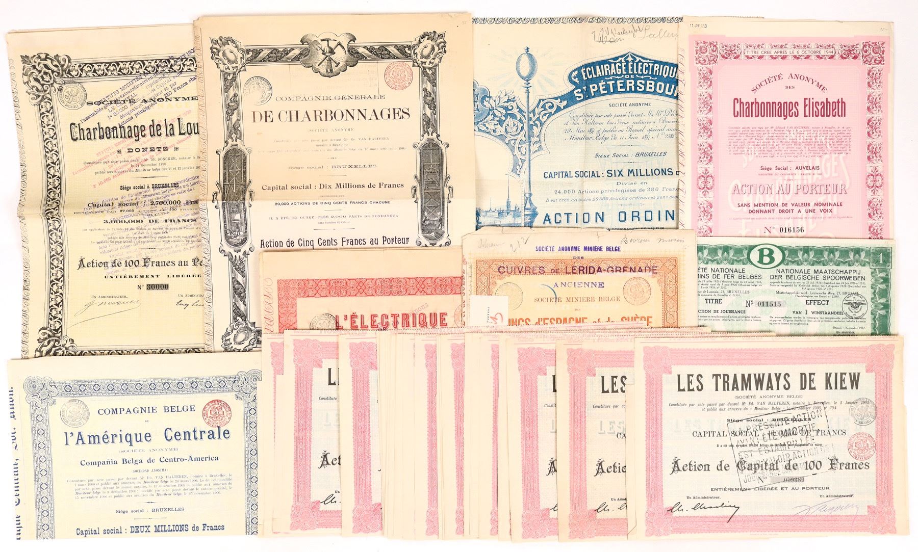 Lot of 25+. Mining, transportation and Electric stock certificates: Les Tramways De Kiew ( Ukaraine Trams system), L'Electrique, National Belgian Railway Co, Central Industrial, Coal Mining.