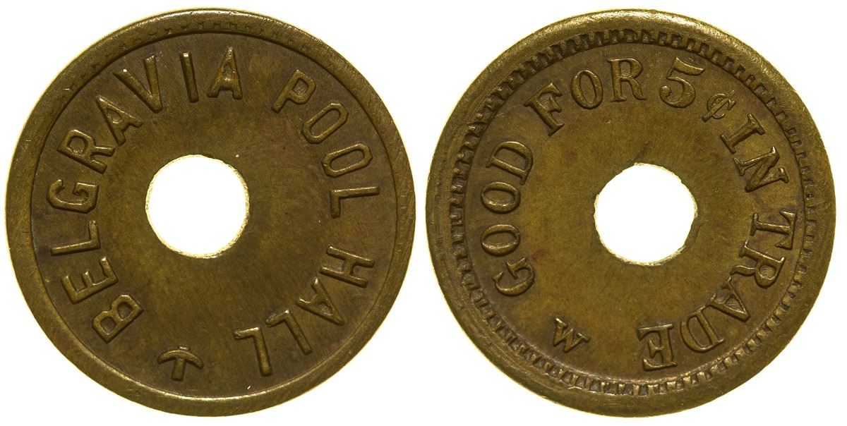 Obv.: Belgravia Pool Hall; Rev.: Good For 5c In Trade. Rd., Br., holed, 21mm. City: Belgravia State: Arizona Date: ID# 45452