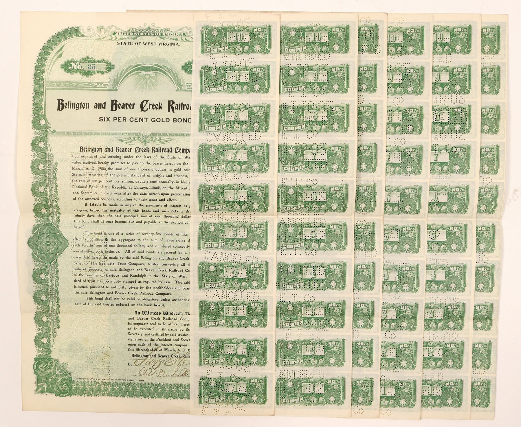 6 cancelled Belington and Beaver Creek Railroad Co $1,000 6% Gold Bond Trustee's certificate with 10 coupons on each bond, raised seal, green border. Dated March 15, 1901, due date March 15, 1906. Belington & Beaver Creek RR Co. operated only in West Virginia between 1899 - 1905. Its' successor was Western Maryland Railroad.