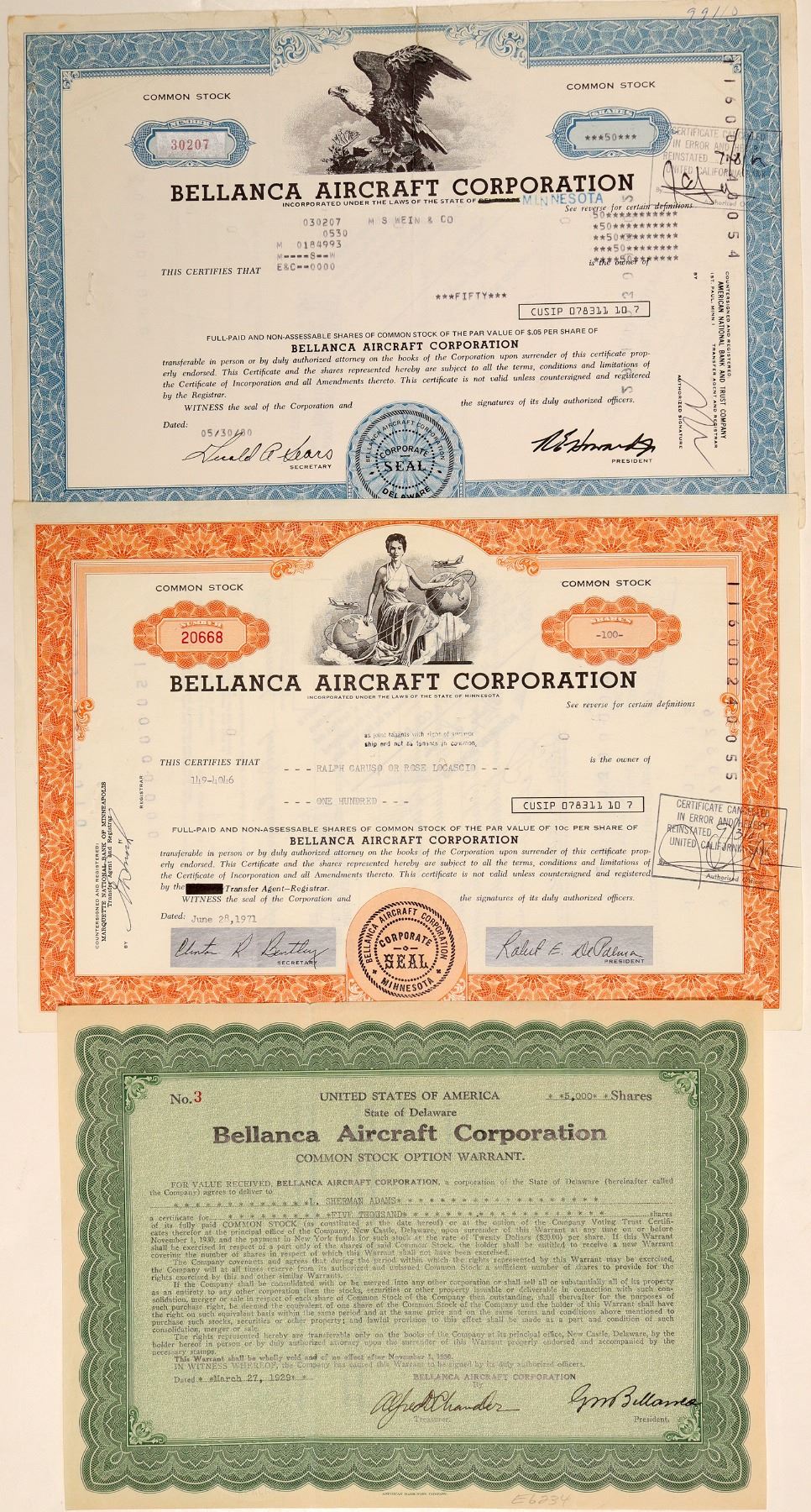 Lot of 3 different. Issued 1929 (number 3 for 5,000 shares to L. Sherman Adams); 1971 (for 100 shares, allegorical vignette, orange border); and 1980 (for 50 shares, bald eagle vignette, blue border). Good condition overall. Founded in 1927 by Giuseppe Mario Bellanca. Bellanca was the designer and builder of Italy's first aircraft. The company was first located in Richmond Hill, New York and moved in 1928 to New Castle (Wilmington), Delaware. In the 1920s and 1930s, Bellanca's aircraft were known for their efficiency and low operating cost, gaining fame for world record endurance and distance flights. Lindbergh's first choice for his New York to Paris flight was a Bellanca WB-2. The company's insistence on selecting the crew drove Lindbergh to Ryan. In 1983, it became AviaBellanca Aircraft Corporation. Ken Prag Collection
