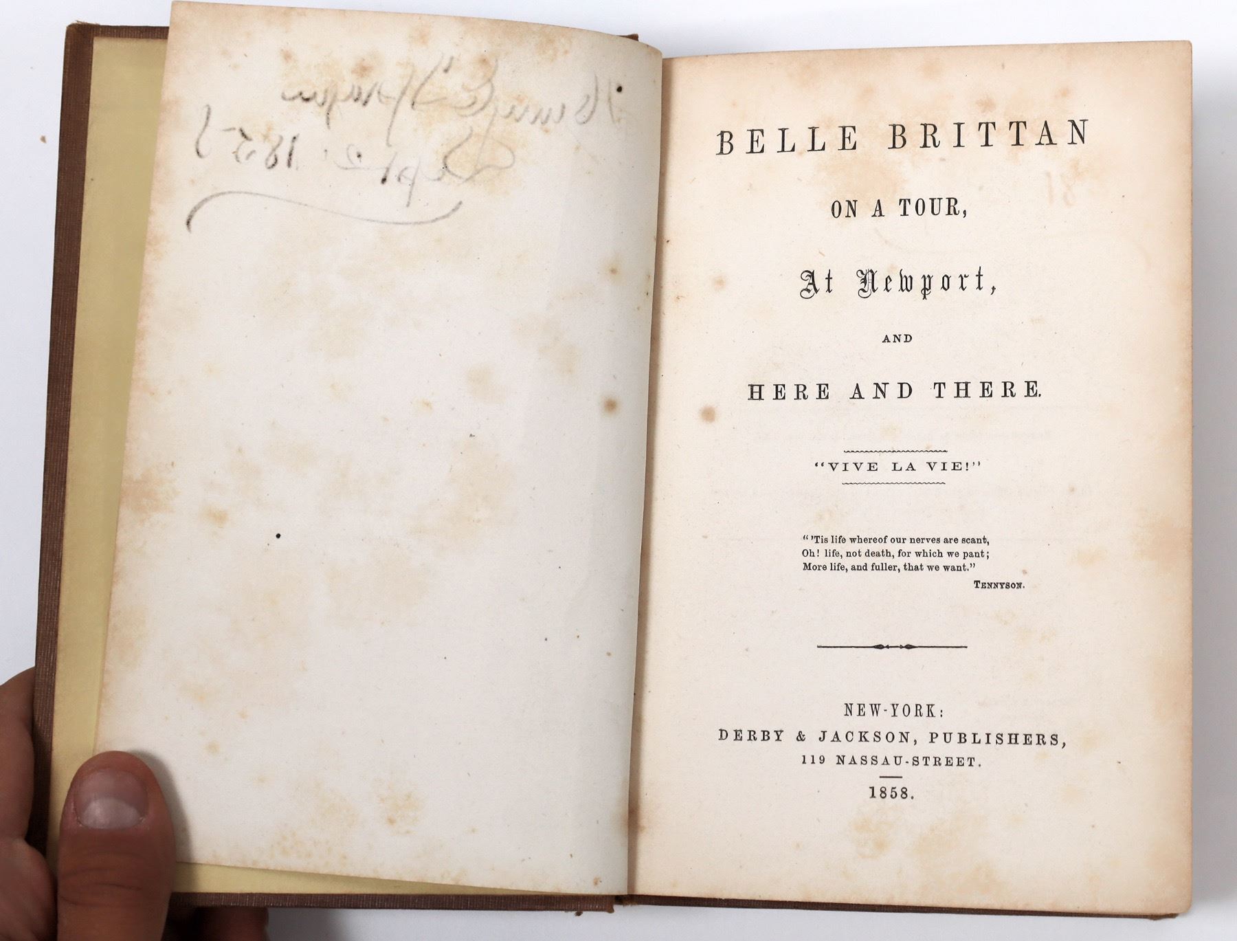 Belle Brittan on a Tour, at Newport, and Here and There. Published by Derby and Jackson in 1858. This is a Gold Rush period tour of the eastern United States. 359 pages. Nice condition, 5 x 7.5 inches.
