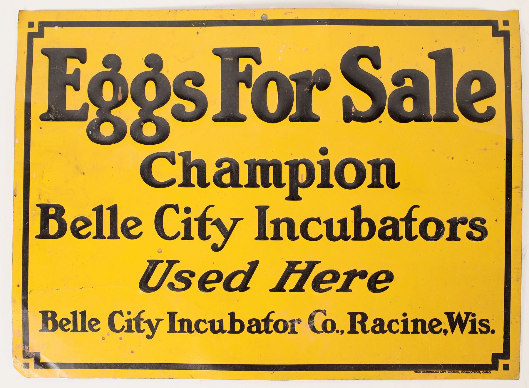 Belle City Incubators metal & porcelain sign in vey nice condition. The company out of Racine, Wisconsin, manufactured hatchery equipment for farmers all over the Unite4d States. This sign measures 10"x 14" and has some slightly ben corners Very bright, very readable. Racine Wisconsin 1920s