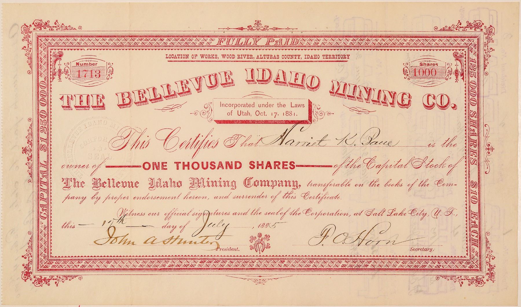 Location of Works: Wood River, Alturas County, Idaho Territory (printed at top). Inc. in Utah, Oct. 17th, 1881. No. 1713, issued for 1,000 shares to Harriet K. Pane on July 17th, 1885. Signed by president John A. Hunter and secretary F.A. Horn. Not cancelled. Red border and print. Many pinholes, folds. 7 x 12" Not in Filer or Holabird indexes. Ken Prag Collection