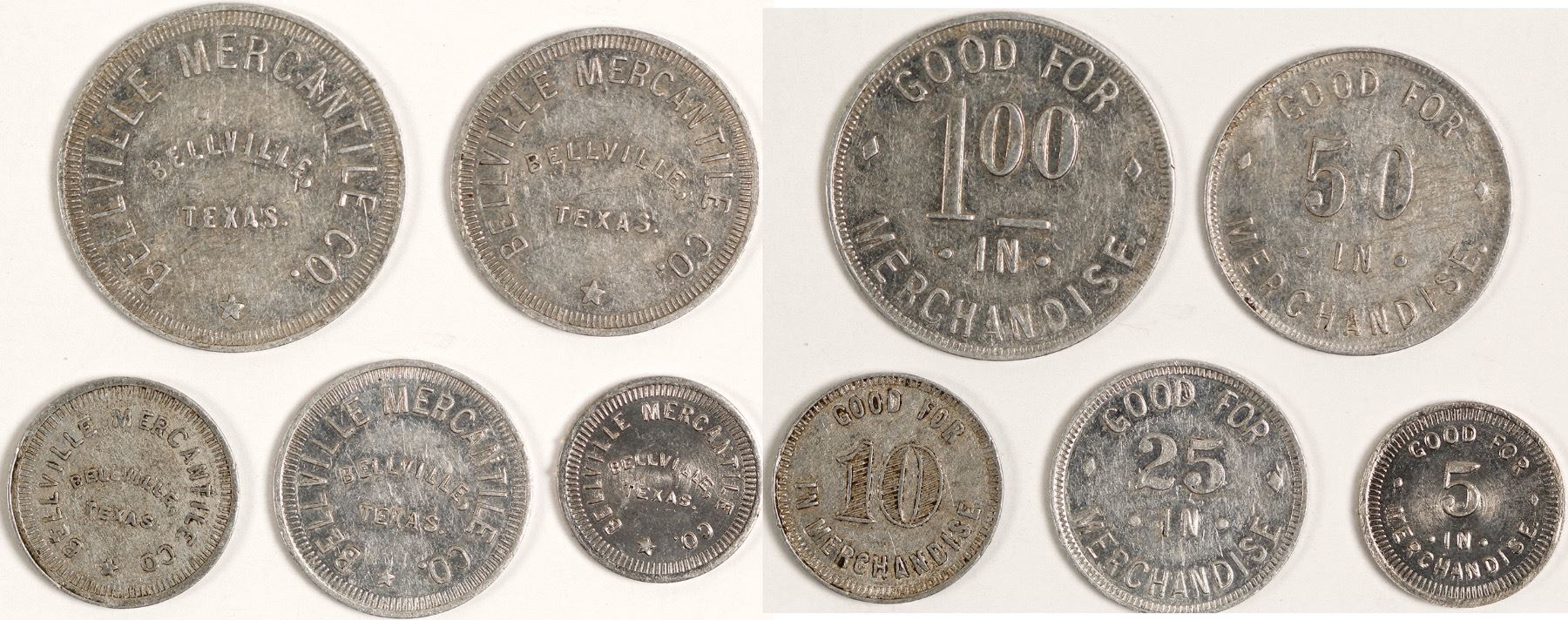 5 Different denomination round aluminum. BELLVILLE MERCANTILE / BELLVILLE, TEXAS. // GF / ? / IM. 5C, 10C, 25C, 50C, $1.00 HWAC# 62338 Date: Location: Bellville, Texas