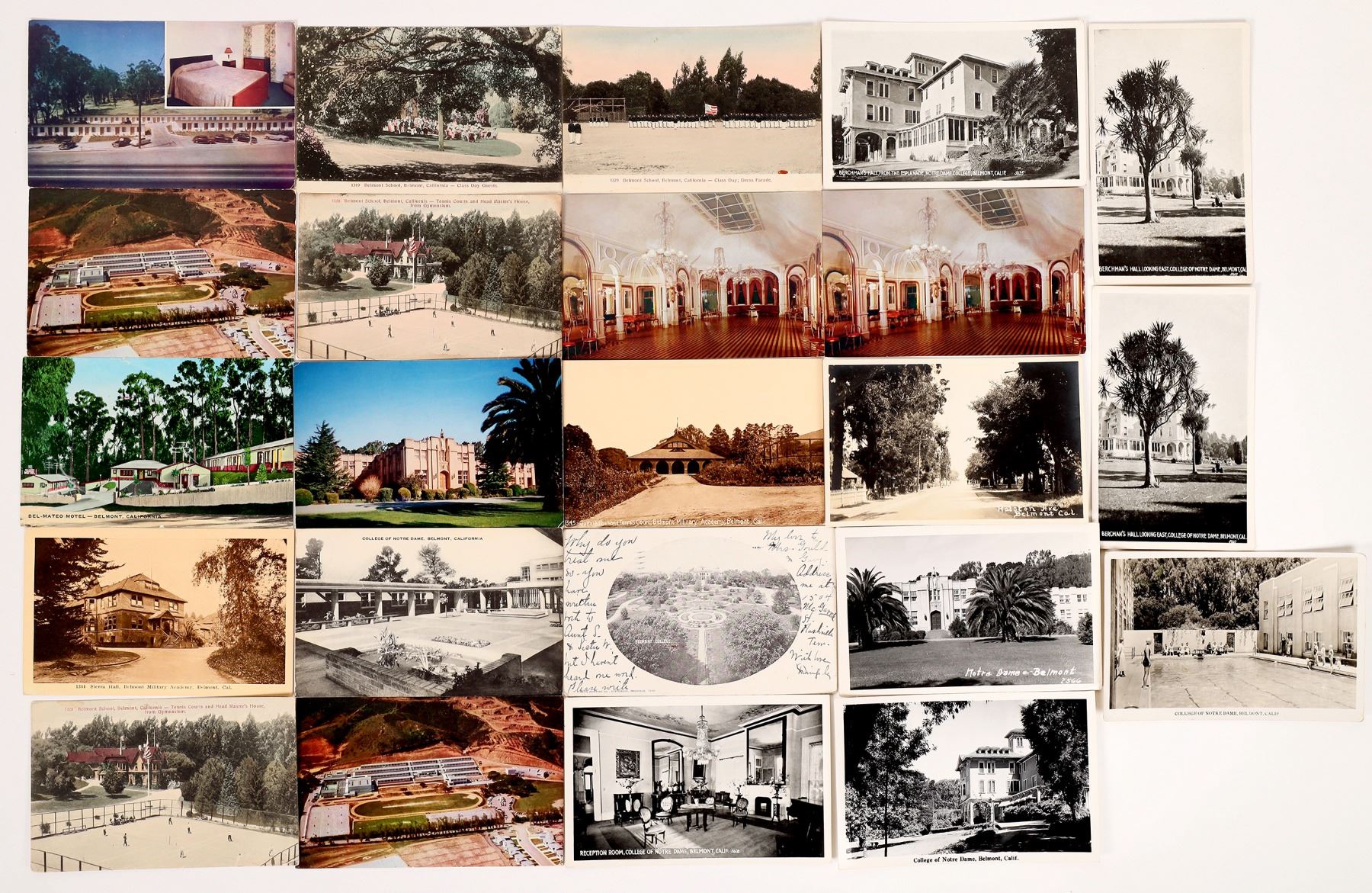 Lot of 21. Four RPC's, two amber cards, mix of borderless and wht border cards. Post marks: Belmont Ca., San Fran. Ground level view: Norte Dame Academy, Ralston Mansion (interior), motels, Belmont School. On Birdseye of Carlmont High School. California Belmont 1903-59 Ken Prag Collection