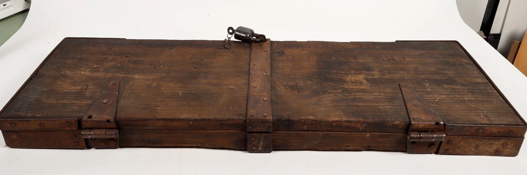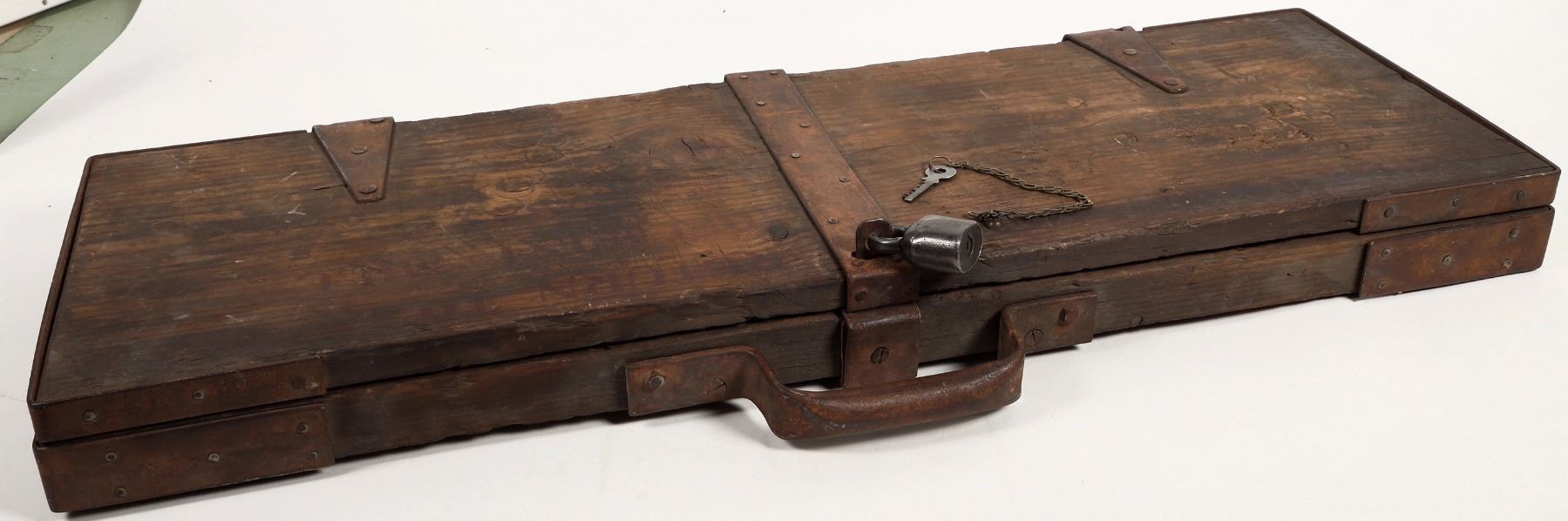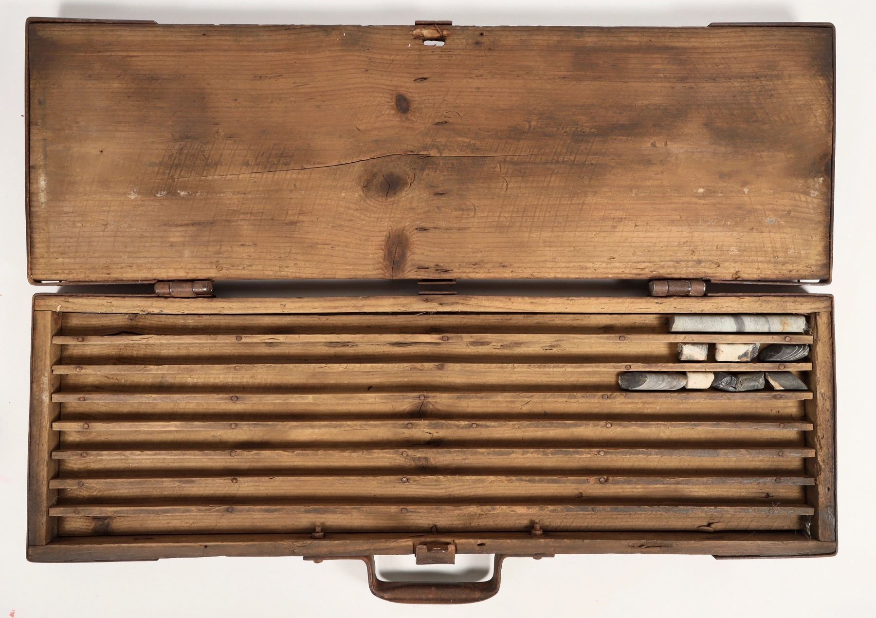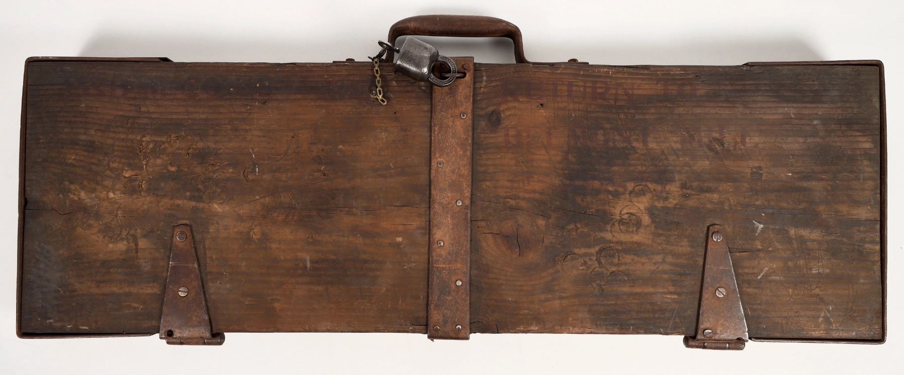 Never seen before! Mind blowing. 38.5" x 16" x 3" This wooden, steal enforced drill core box with lock (lock not original) marked "return to Belmont mill for assay" this is the first such locking drill core assay box we've handled in 50 years. The purpose of this box would have specifically been to assay high grade sections of ore from the Highlander or other high grade silver mines at Belmont. Yours truly (FH) mined and milled all of the old tailings at Belmont in the early 1980s so they are gone today. Has room for about five 3' sections of 1" core. This is a remarkable locking assay box that we're lucky still exists. Belmont silver ores ran as high as tons of silver hence the need for secrecy and the need for chain of custody issues.