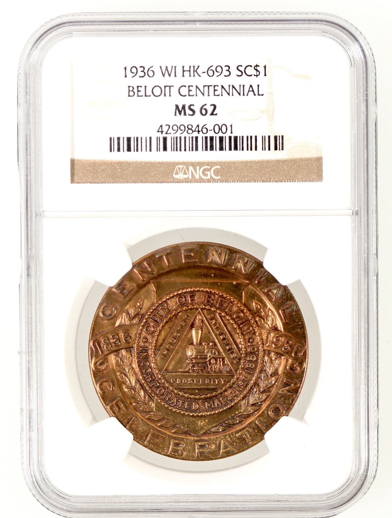 NGC certified MS 62. HK-693. Obv. City Seal (?) on shield; to l., on ribbon 1836; to r., on ribbon 1936; above Centennial; below Seal Celebration. Rev. Across 100th / Anniversary / Official / Souvenir; below is Beloit on ribbon across shield and open wreaths; above all, around are ornamental designs; at bottom edge, microscopic Greenduck Co Chicago. Bronze. 37mm.