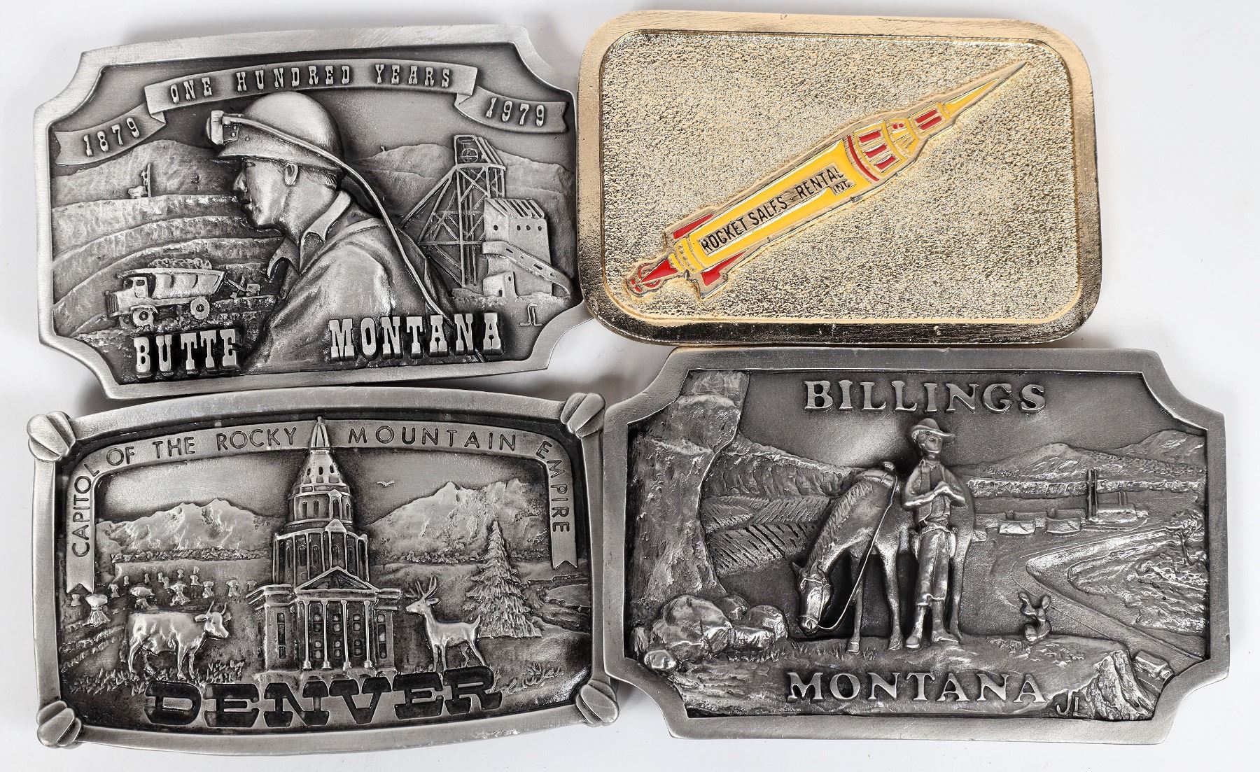 Group of four belt buckles. Three are pewter belt buckles made by Art Industries in 1979. They are for Billings, Montana (limited edition of 850), Butte, Montana (limited edition of 850), and Denver, Colorado (limited edition of 2500). The other belt buckle is from Rocket Sales Rental Inc. Each buckle is about 3.5 x 2 inches.