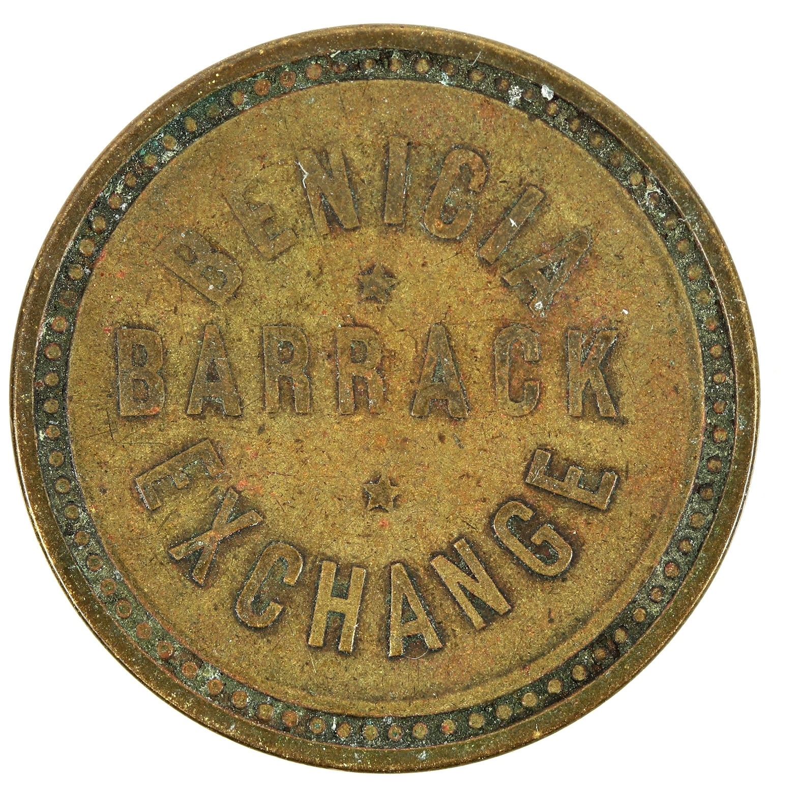 Rare denomination! Benicia / Barrack / Exchange // 3 1/2; Br., rd., 27 mm.