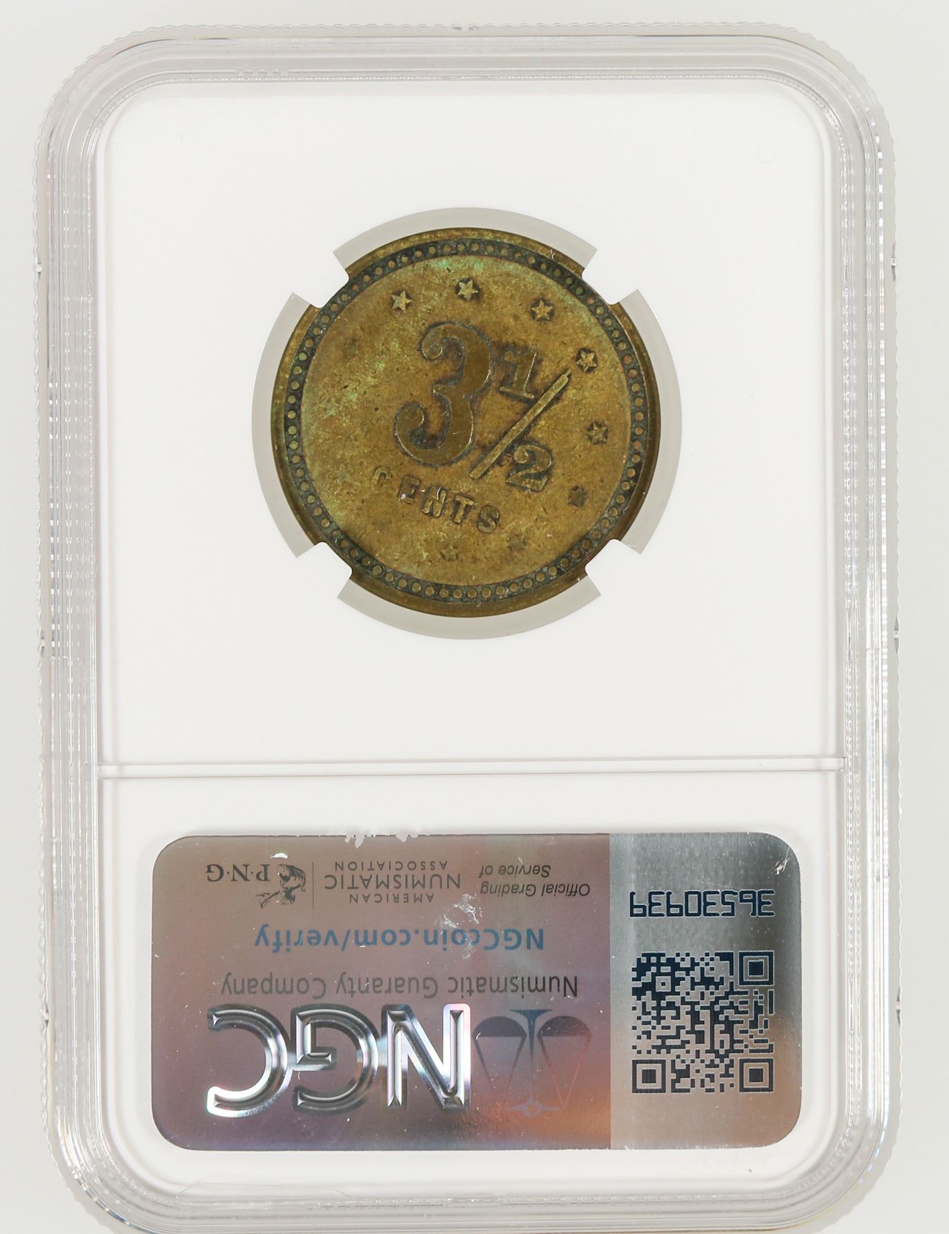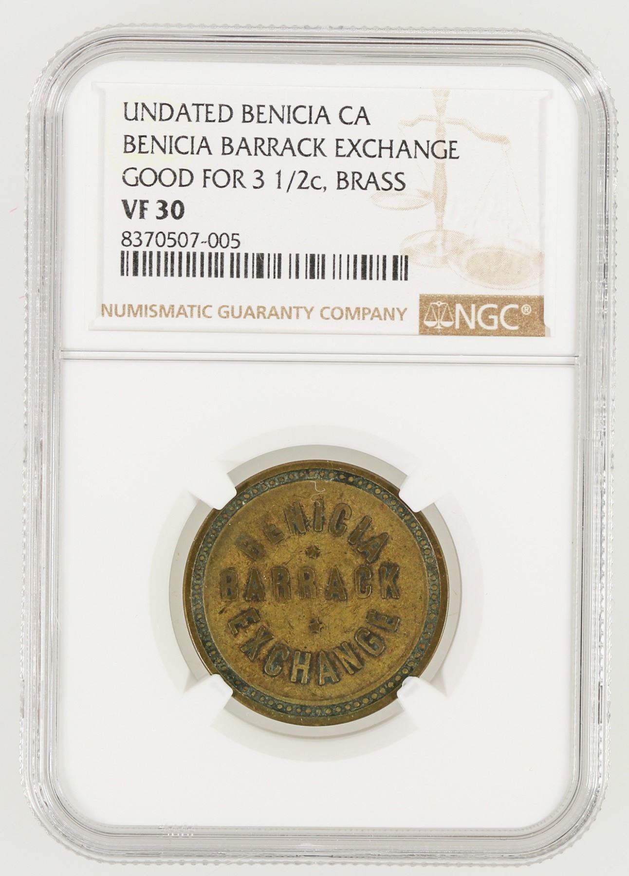 NGC certified VF 30. BENICIA / BARRACK / EXCHANGE // 3¬Ω / CENTS / (stars); Br., rd., 27 mm.