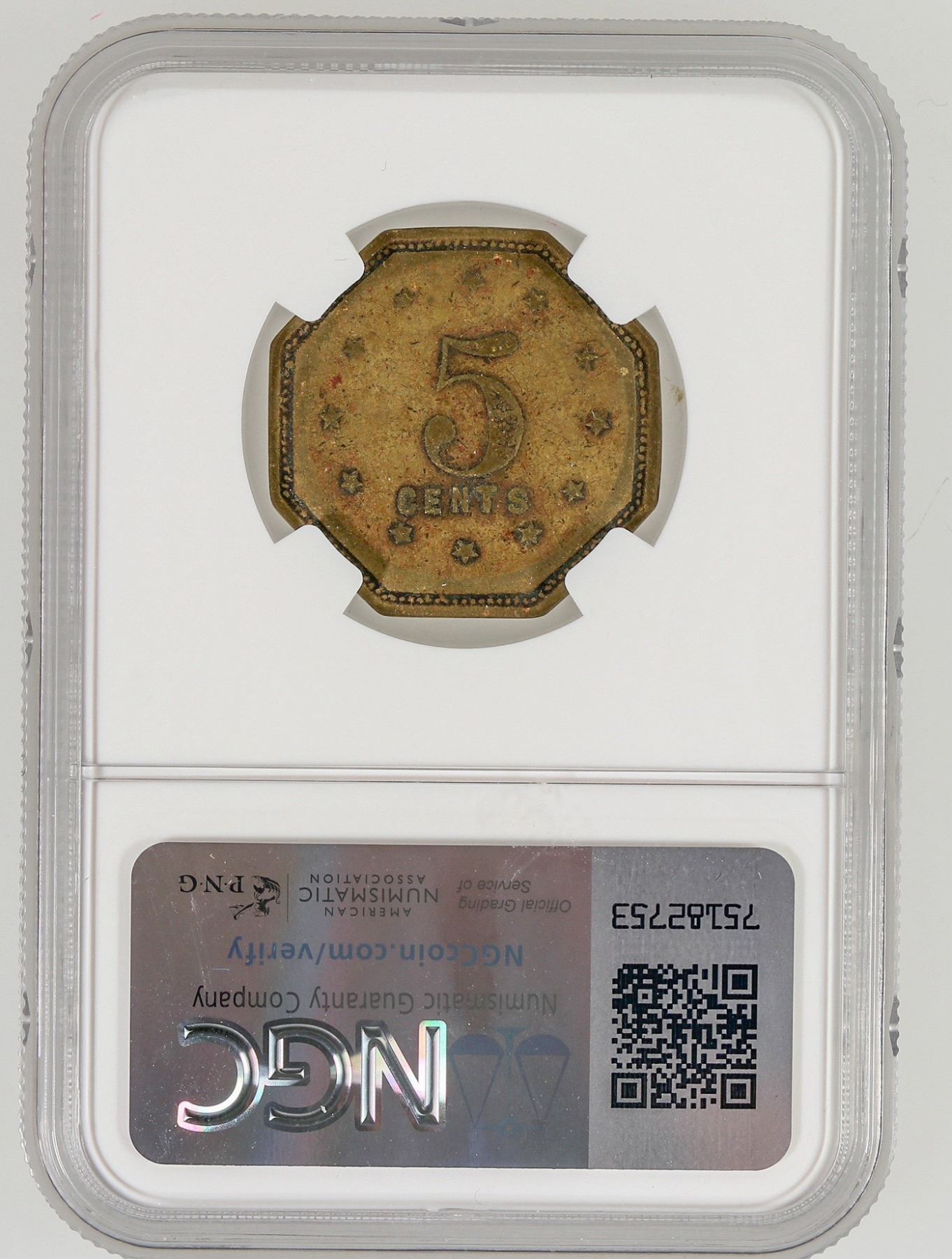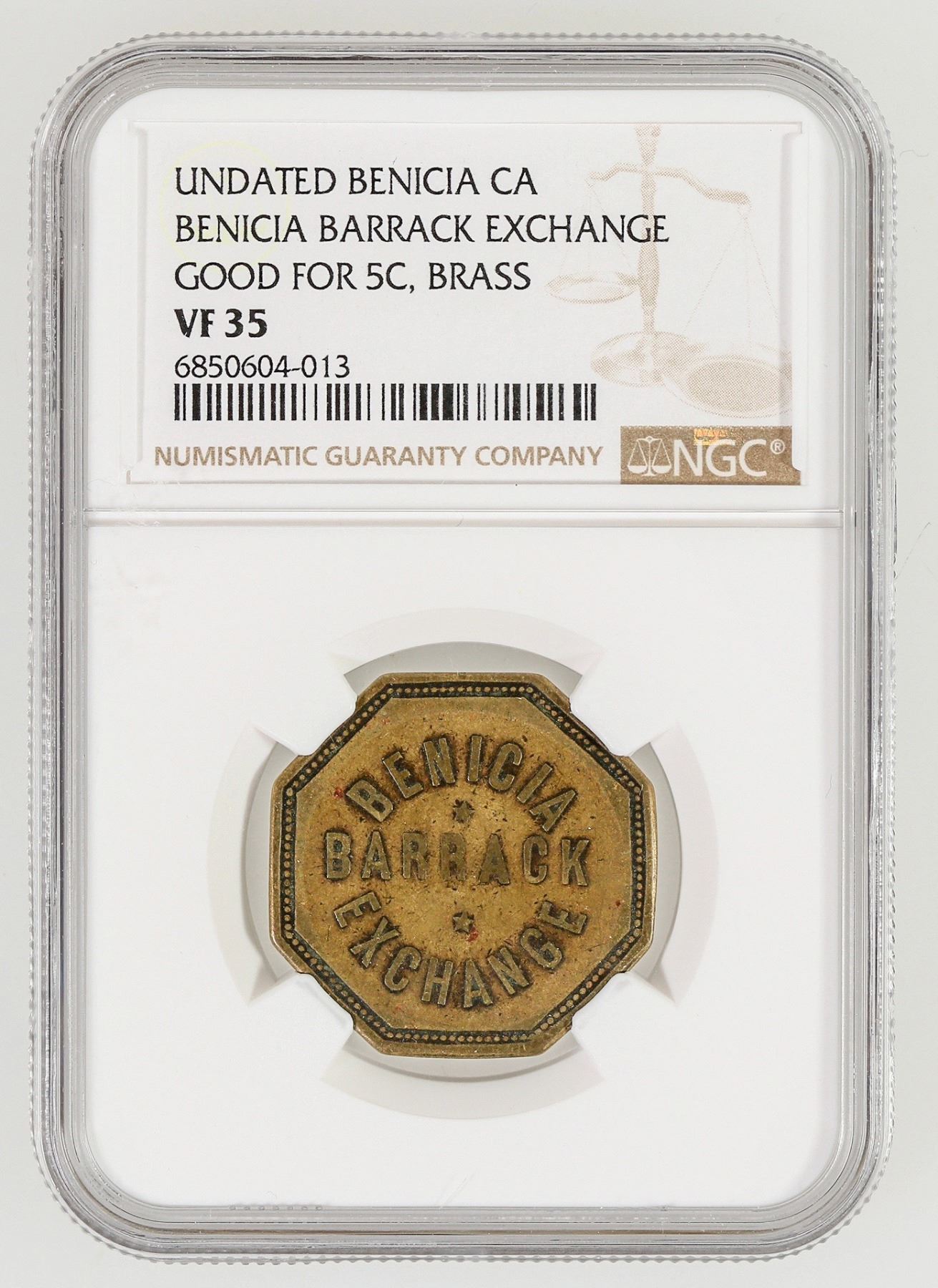NGC certified VF 35: BENICIA / BARRACK / EXCHANGE // 5 / CENTS / (stars); Br., octagonal, 26 mm.