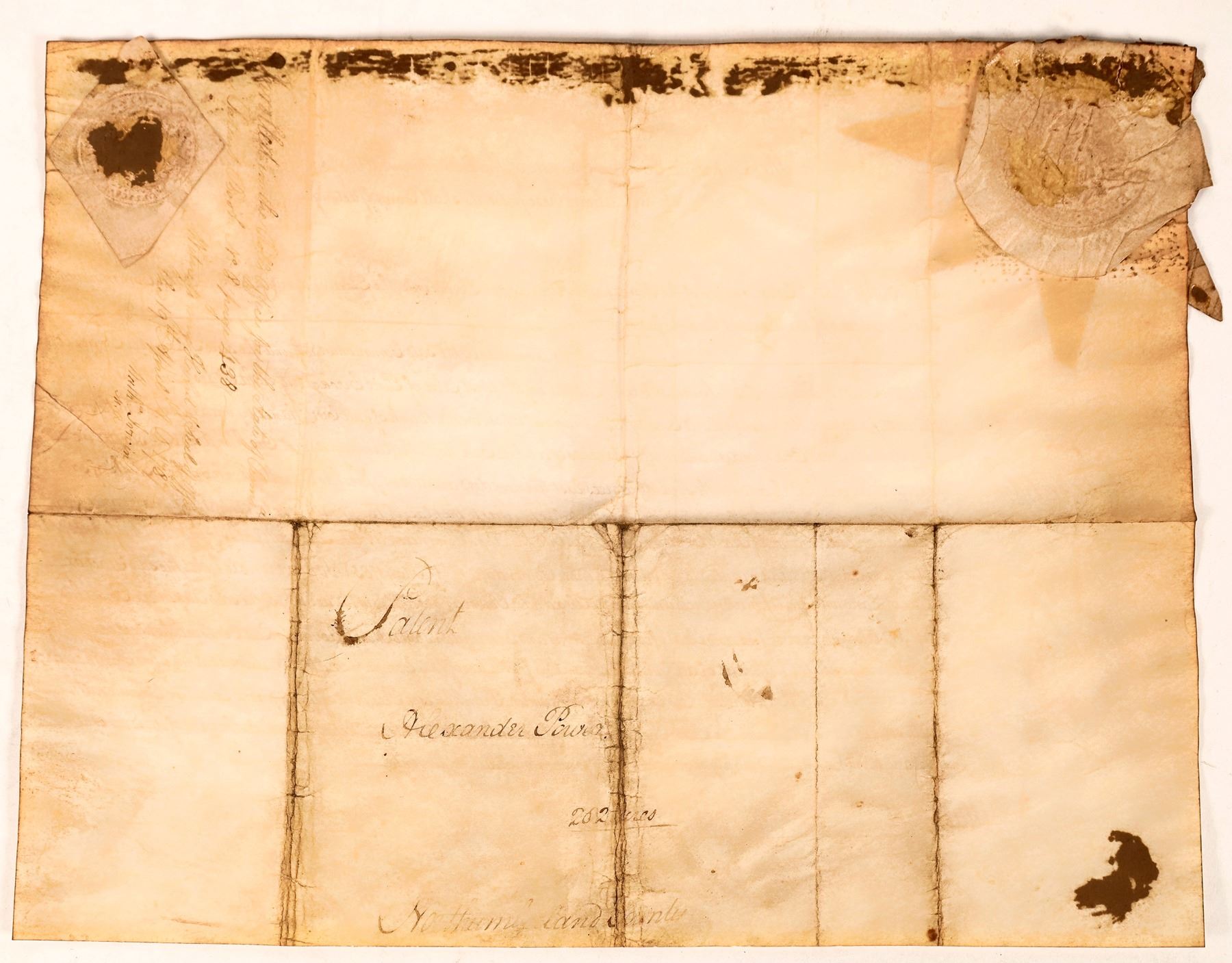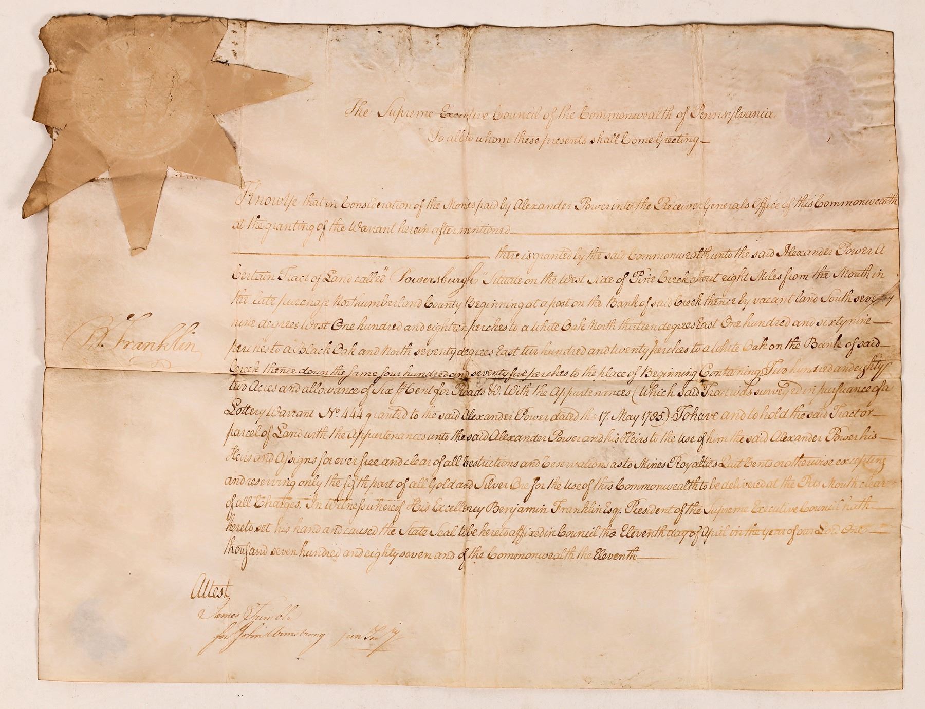 Land deed signed by Benjamin Franklin as President of the Supreme Executive Council of Pennsylvania, April 11, 1787 for 282 acres known as "Powersburg", on the west side of Pine Creek. The deed mentions the land "from the late purchase" which was that the land was recently purchased from the Indians. A royalty of one fifth of the minerals produced was due the Commonwealth of PA. Hyatt's notes indicate "in the early days it was thought our mountains contained quantities of gold and silver" (Hyatt provenance document, p16).