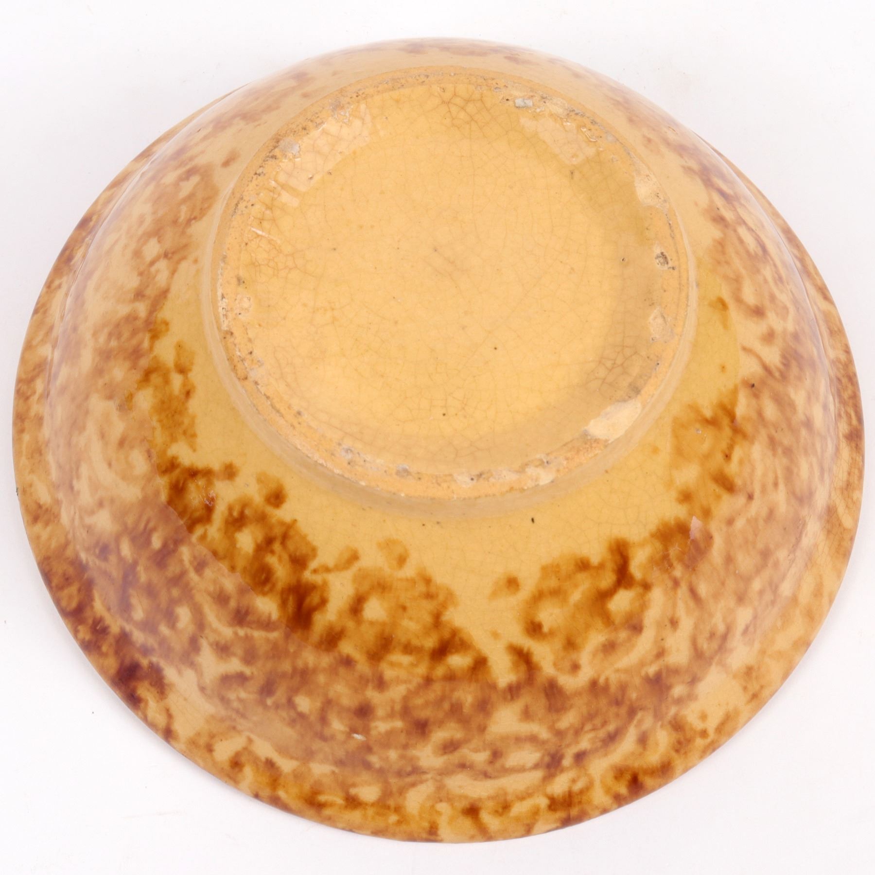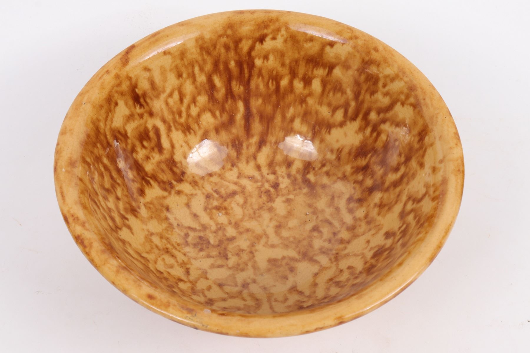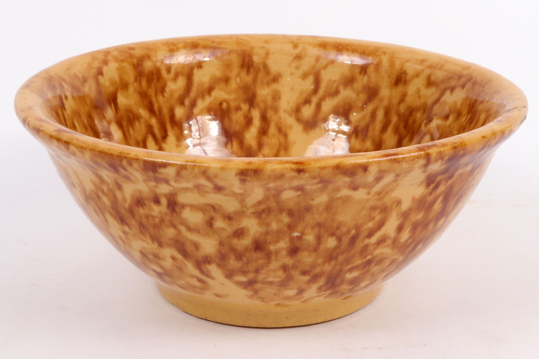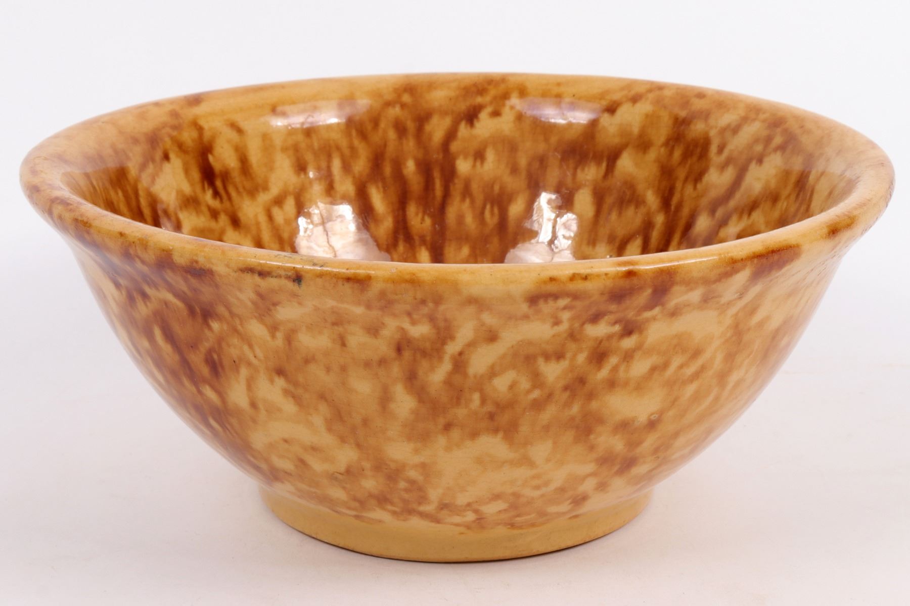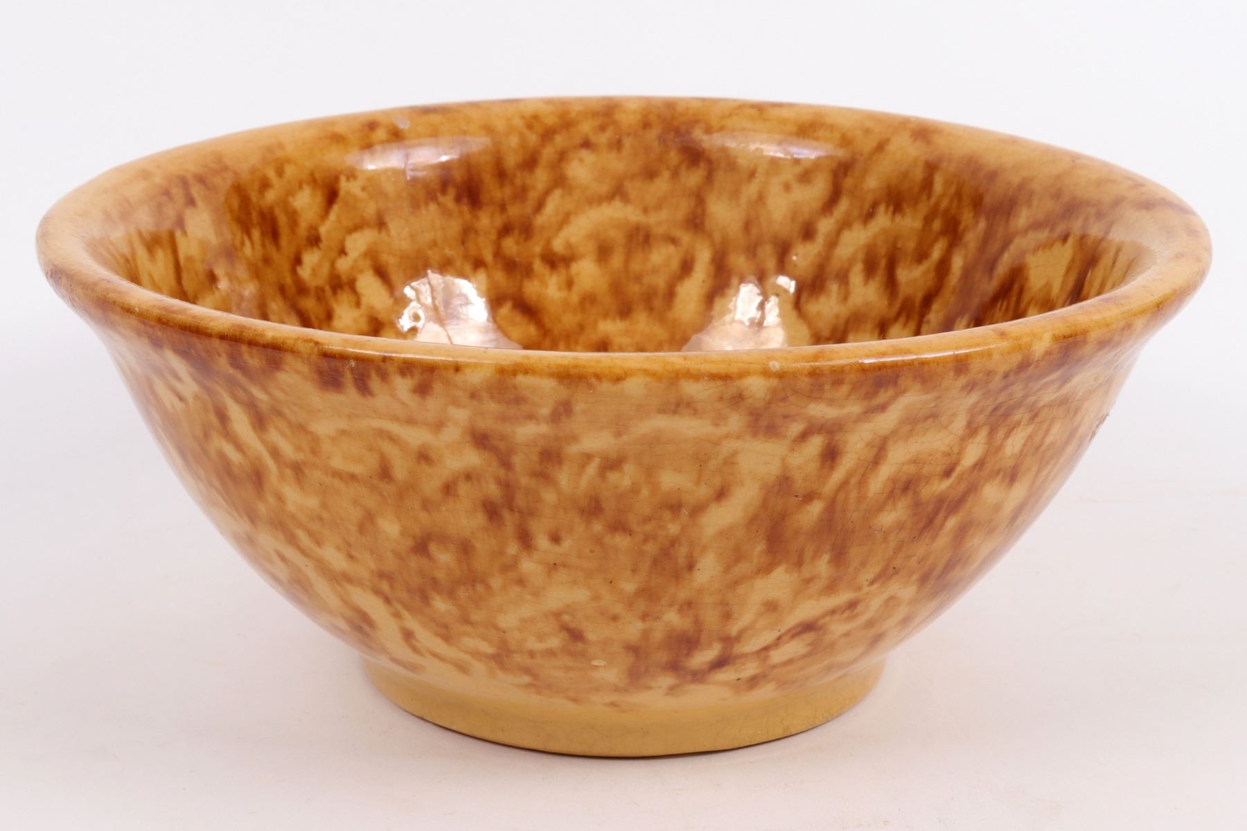 Brown marbled bowl in the style of Bennington pottery. 3.5x8.75". A few small base chips, mostly not visible from exterior. Gary Bracken Collection
