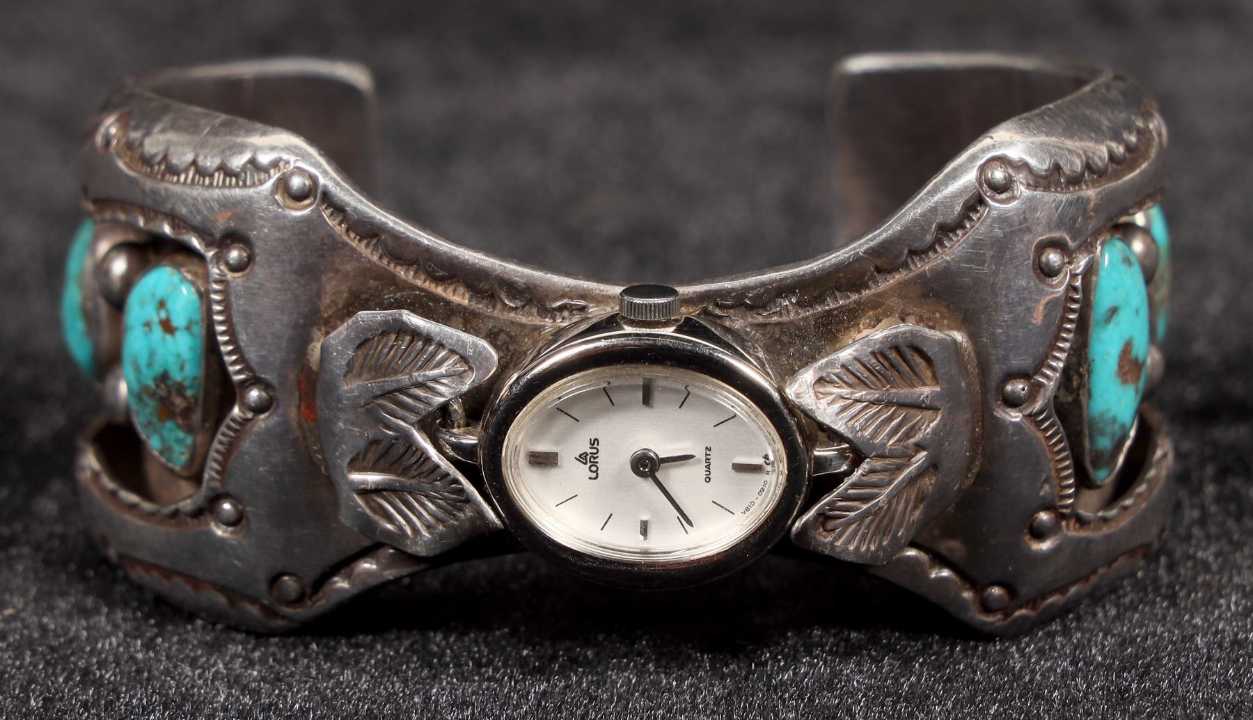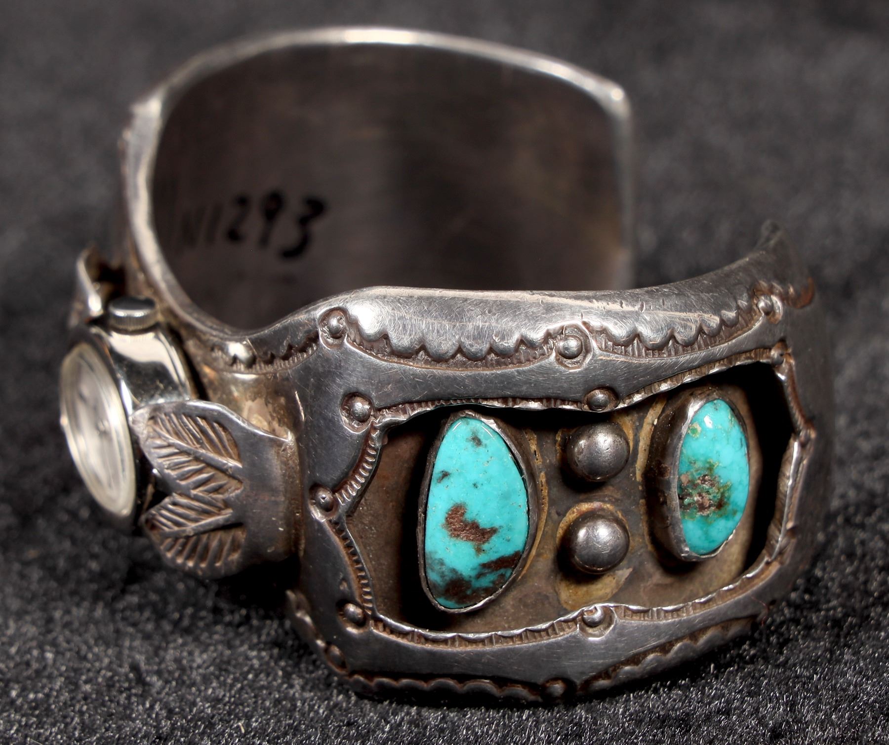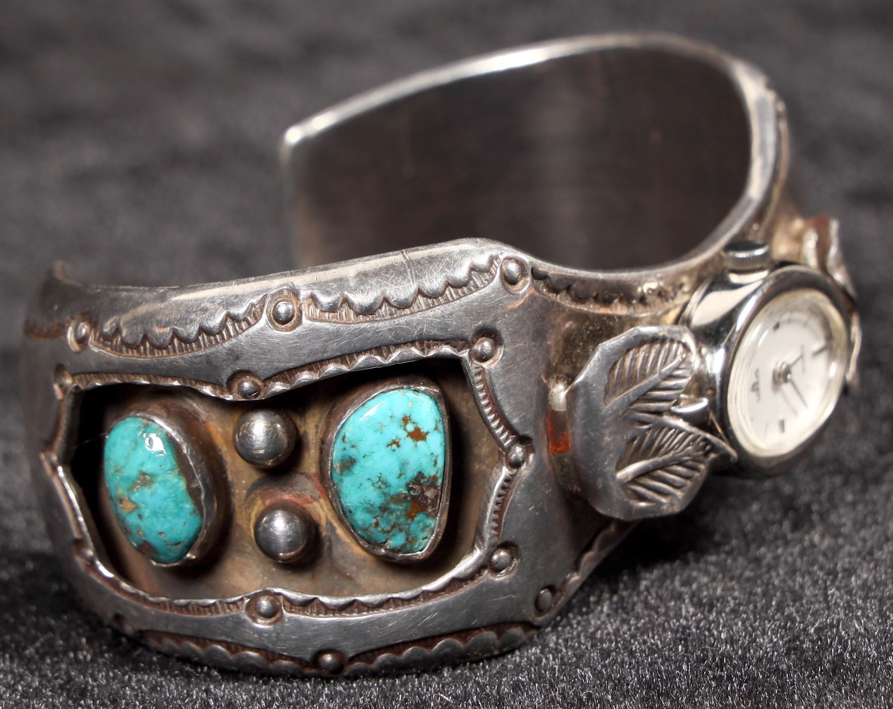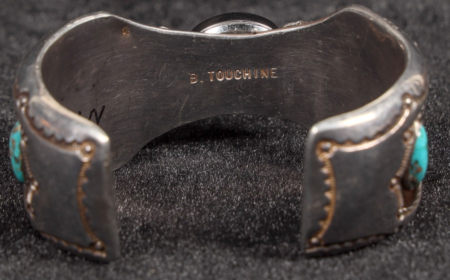 This is a vintage Navajo made watch bracelet by silversmith Benny Touchine from Church Rock, NM Region, the band width is 1 ¼" at it's highest point down to 1" at the opening, there are two turquoise stones on each side of the band and the piece is signed B. Touchine, the piece has a great patina and will polish to a bright silver, watch is in good condition and currently running well.