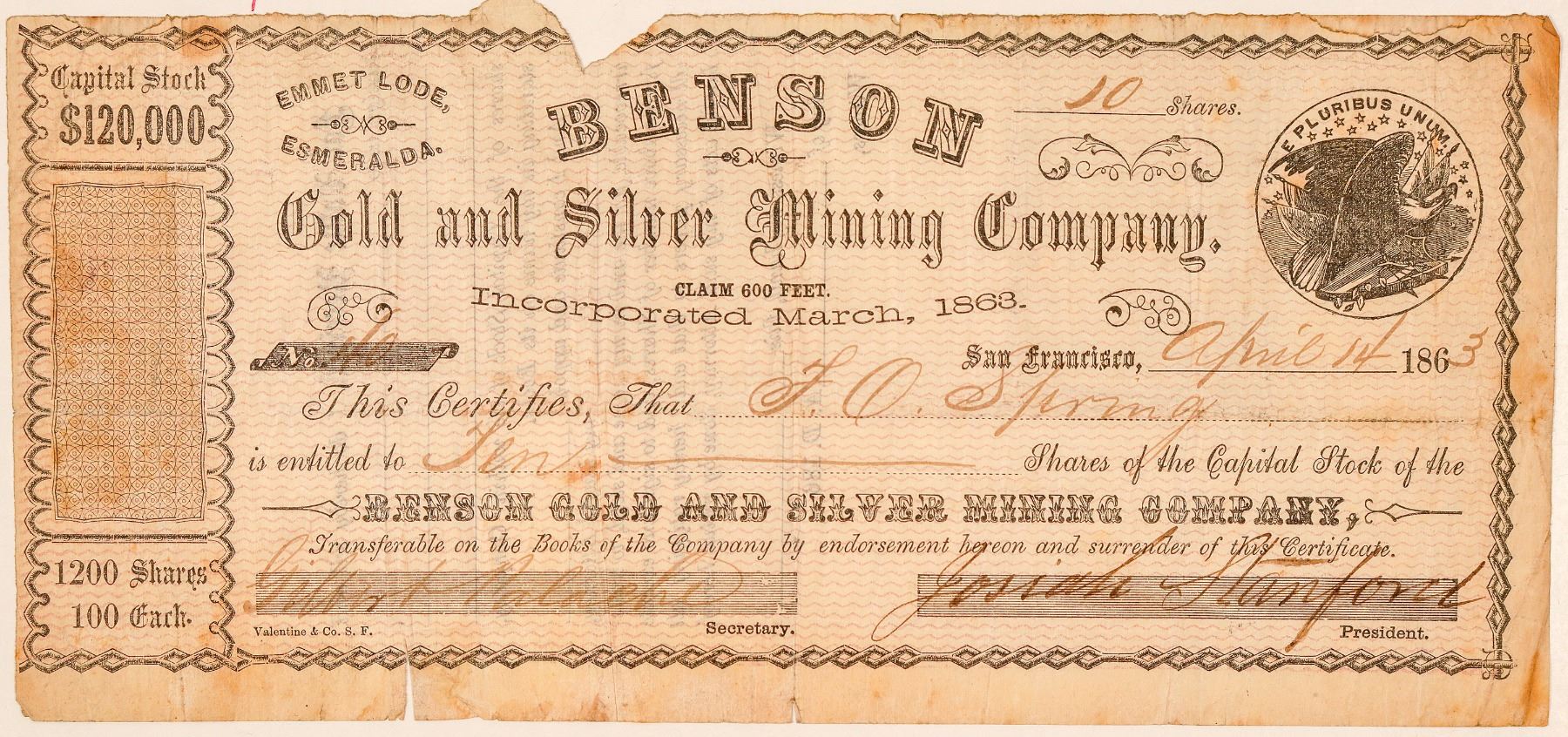 Nevada territorial signed by Leland Stanford's brother. Emmet Lode, Esmeralda (printed upper left). "Claim 600 Feet" (printed under title). Inc. March 1863. No. 40, issued for 10 shares to F.O. Spring on April 14th, 1863 in San Francisco. Signed by president Josiah Stanford and secretary Gilbert Palache. Not cancelled. Black border and print. Vignette of patriotic eagle (upper right). Printed by Valentine & Co., SF. Folds, some separation, toning, some staining, portion missing along top border, other wear. Please inspect. 4 x 8.75" Not listed on Stretch's 1865 list of 400 Esmeralda Mines. Probably named after George Benson, an elected official in Aurora and investor in many mines. Josiah Stanford was the older brother of Leland Stanford. Leland had interests in Bodie and Esmeralda mines, being president of the Bodie Bluff Consolidated. He was elected California governor during his tenure as president, and likely had his brother look over his Bodie/Aurora interests (like the Benson). Josiah was a California pioneer who came to California in 1849 and became a merchant at Mormon Island before running a hardware company in Sacramento. He died in 1890. [Ref: Filer 3, pg. 44 where Josiah is misidentified as Leland's father; Daily Alta California, May 15th, 1890] Ken Prag Collection