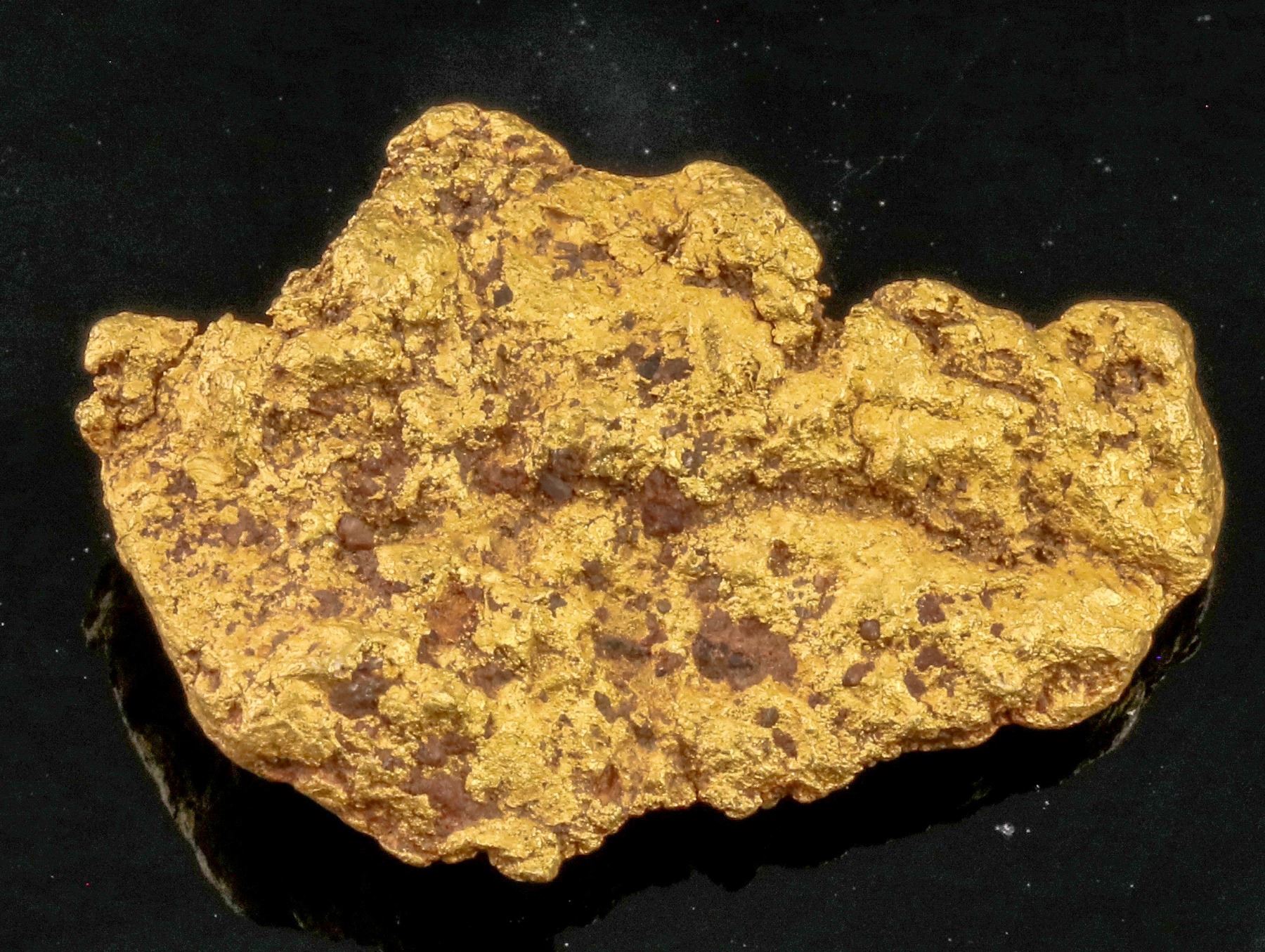 The "Nugget Ace" Collection here contains a number of gold nuggets from very scarce locales in Kern and Inyo counties. While he found more than 6000 nuggets over 50 years using early metal detectors, its the "big ones" that stand out, and at an inch across, this one easily fits the bill as an excellent example from an exceptionally arid desert region of the Mojave Desert. The story of Benson Gulch can be found in other lots within this section. 10.9g [ Kern Co., Benson Gulch California