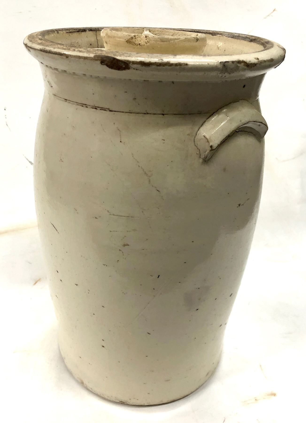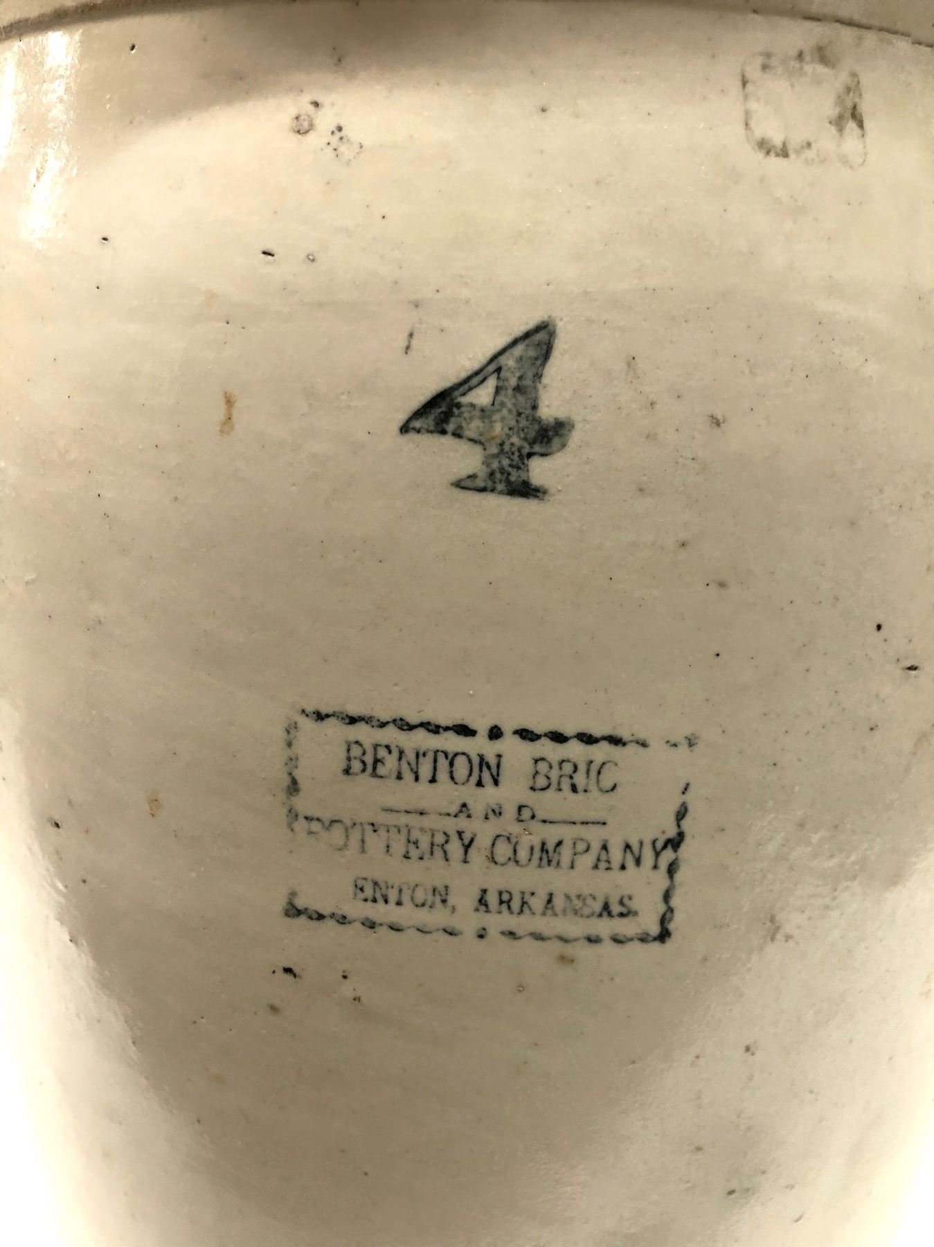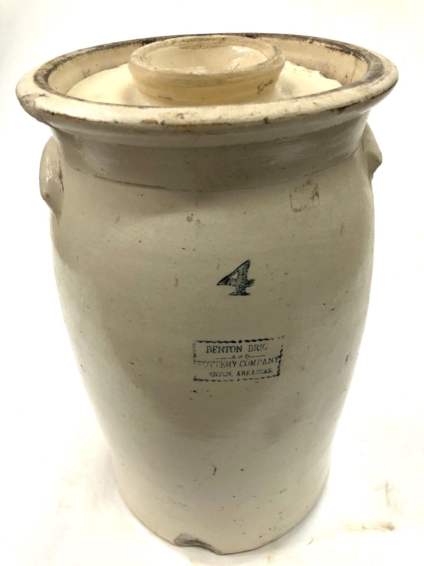 Benton Brig & Pottery Co., Enton, Arkansas #4 Stoneware with top. 10" diameter, 16" tall. large 2" base chip, three rim ships. several cracks probably from the heat/glaze process at handles.