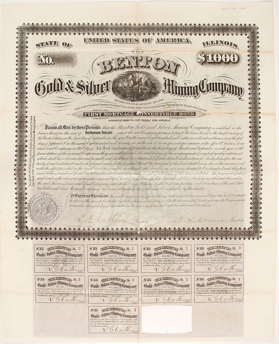 Inc. in Illinois. Mine located in the Queen Mining District, Clear Creek County, Colorado, 3 miles from Georgetown on Brown and Sherman Mountains. According to Corbett (1879), the main shaft was 80' deep, tunnels 70' and 30'. Ore is galena, tetrahedrite and pyrite producing 100 ounces of silver per ton. Bond is low no. 7. Nine coupons remaining (one cutout). Silver background, fancy logo and underground mining vignette. Signed by president Evans and secretary Calkins. Deep folds with wear in middle fold. 19 x 15" Date: 1876 Location: Clear Creek County, Colorado HWAC# 62759
