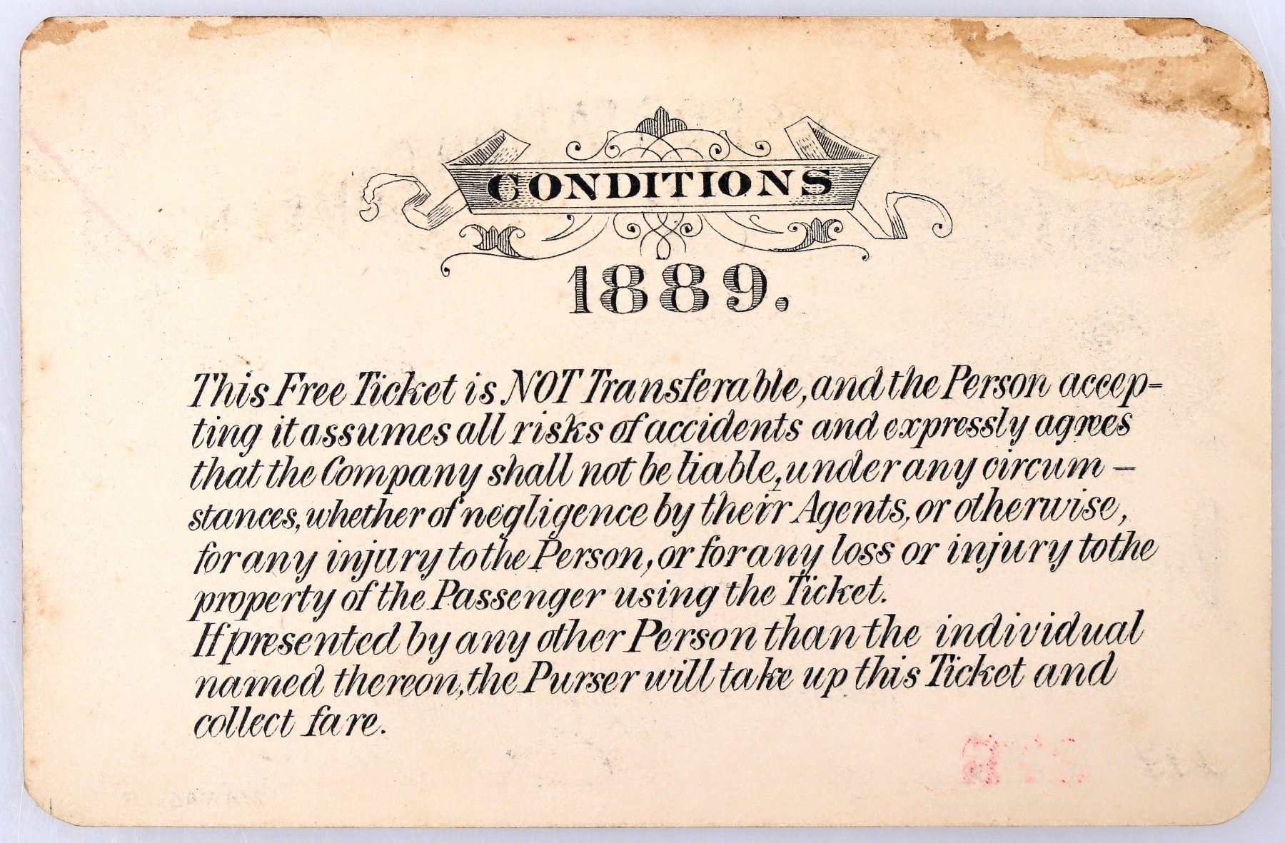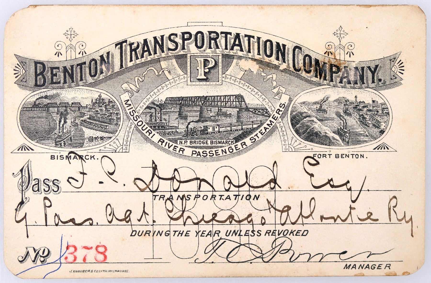 Nice pictorial pass for this company that operated steamers on the Missouri River between Bismarck and Fort Benton. No. 378, issued for the year 1889 to FC Donald. Preprinted signature of manager TC Power. Three vignettes: steamer at Bismarck, bridge and train at Bismarck. and steamer at Fort Benton. Printed on cardstock by Knauser & Co. Lith., Milwaukee. Some staining on front and reverse. Powerful Montana mining, mercantile and real estate mogul T.C. Power formed this company in 1874. He was a military and Indian trader at Ft. Benton. He later became a US Senator.