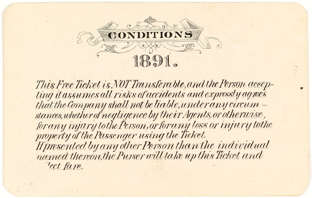 Nice pictorial pass for this company that operated steamers on the Missouri River between Bismarck and Fort Benton. Three vignettes: steamer at Bismarck, bridge and train at Bismarck. and steamer at Fort Benton. No. 472, issued in 1891 to J.T. Skinner, vice-president Syracuse & Baldwinsville. Printed on cardstock by Knauser & Co. Lith., Milwaukee. Powerful Montana mining, mercantile and real estate mogul T.C. Power formed this company in 1874. He later became US Senator. (Prag Collection) City: Ft. Benton State: Montana, Date: Inventory# 39047