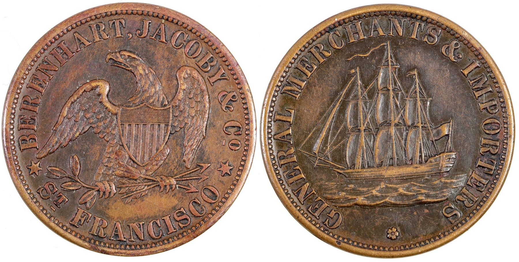 Rare gold rush store card/token, in fabulous condition, EF-AU, if not better. BERENHART, JACOBY & CO / ST FRANCISCO / (eagle with shield)// GENERAL MERCHANTS & IMPORTERS / (pictorial sailing ship); Br., rd., 26 mm. Located at Montgomery and Pine in San Francisco's gold rush; a newspaper ad dates their business to 1851. San Francisco California