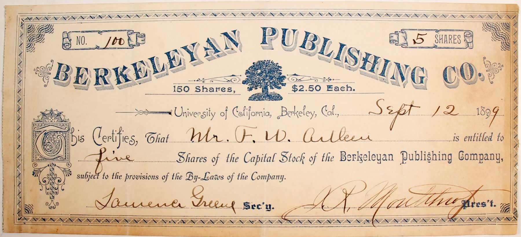 Five shares of Berkeleyan Publishing Company capital stock, number 100, dated September 12, 1899 issued to Mr. F. W. Artleeu. Ken Prag Collection. State: California City: Berkeley Date: HWAC# 81843