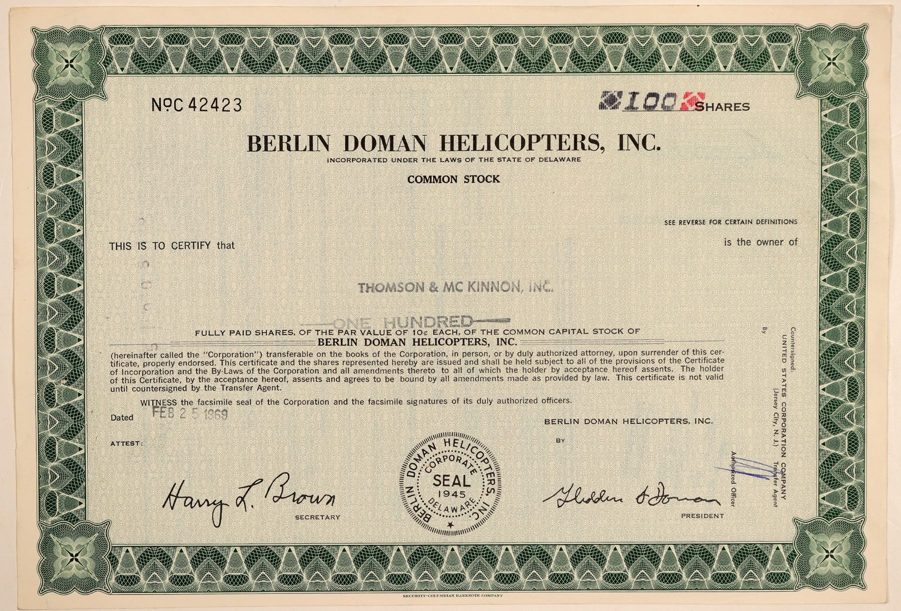 Inc. in Delaware, 1945. No. C42423, issued for 100 shares to Thomson & McKinnon, Inc. on Feb. 25, 1869. Printed signatures of the president (Doman) and secretary (Brown). Not cancelled. Green border and background, black print. Pinholes, folds. 8 x 12" Founded in 1945 by Glidden J. Doman at Danbury to construct rotorcraft with hingeless rotorblades and totally enclosed self-lubricating hub. Operations transferred to Puerto Rico, with continued production of DB-10B and name changed in 1967 to Berlin-Doman Helicopters. Ken Prag Collection