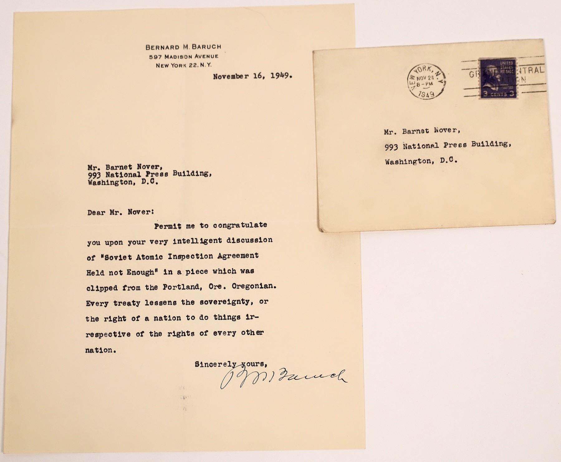 Typewritten letter w/envelope to Mr. Barnet Nover/journalist signed by Bernard M. Baruch/NYC congratulating Mr. Nover for an article he wrote titled "Soviet Atomic Inspection Agreement Held not Enough." Dated November 16, 1949. Rare. Placed under "Goldfield, Nevada" because Baruch was the key financier behind George Wingfield and the Goldfield Consolidated Mines, which built a huge mill at Goldfield in 1909 that reaped great profits for Baruch and Wingfield. Note: Bernard Baruch (1870 - 1965) became one of the country's wealthiest and most influential men of the early-mid 20th century, advising Presidents from Woodrow Wilson to Harry Truman. From his Wall Street office in the early 1900s he helped finance the Goldfield Consolidated Mining Company, the Getchell Mine and many other Nevada mining enterprises. Baruch had a quiet and private office in a building at Red Mountain, California (near Randsburg) still there today. He may have been a private financier for the Yellow Aster or the tungsten mines at Red Mountain. We have had very few documents signed by Baruch. State:Nevada City:Goldfield Date: Provenance: