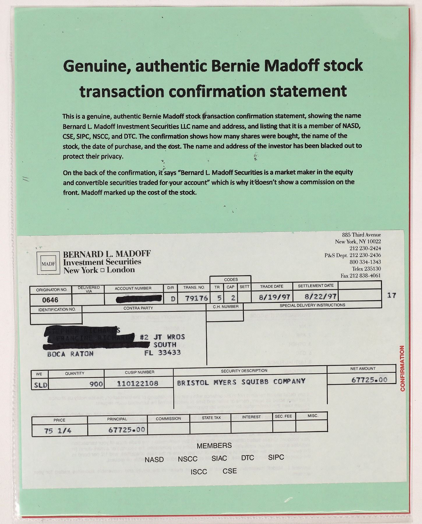 Stock confirm from the fraudster's Brokerage firm. Madoff pilfered about $50 billion from his clients and most of these so-called trades were fake. In this case, the client thought he had sold 900 shares of Bristol Myers, but likely the trade never existed. Madoff was the head of the N.A.S.D. and highly respected in the industry until it came to light that he was running a Ponzi scheme. When clients asked for their money, there wasn't any, even though they had been told for years that they were making great returns. The client's name is blacked out to protect their identity. Many Madoff clients lived in Boca Raton in the Jewish community there.