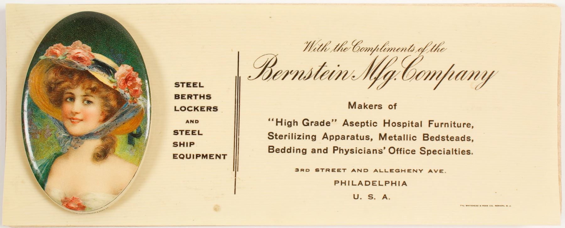 Lovely lady in a bonnet on oval emery board attached to pad of paper "with the compliments of the / Bernstein Mfg. Company." Choice original condition.