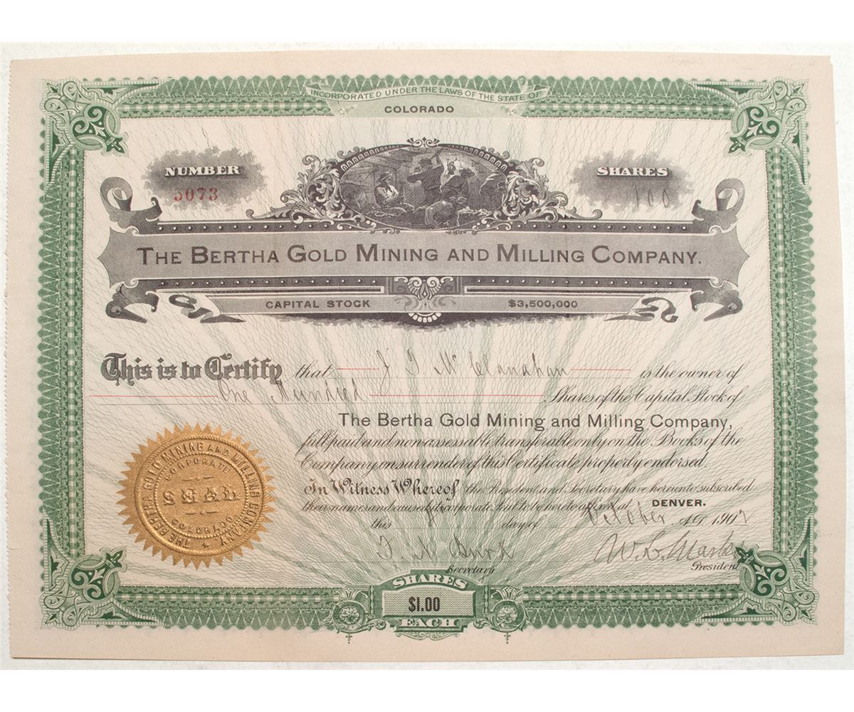 Incorporated in Colorado, with offices in Denver and mines in Cripple Creek. No. 5073 issued to J McClanahan for 100 shares on October 4 1902. Excellent condition