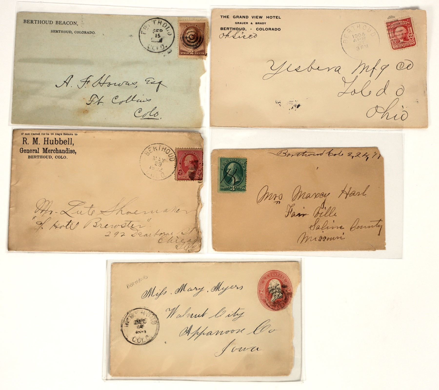 Lot of 5 different. Includes: corner ad cover for RM Hubbell, 1892; corner ad for The Grand View Hotel, 1904; corner ad cover for Berthoud Beacon; cover with Berthoud cancel (illegible); and early manuscript cancel 1878. Today Berthoud is noted for having one of the Highest paved roads in America at 11,000 feet.