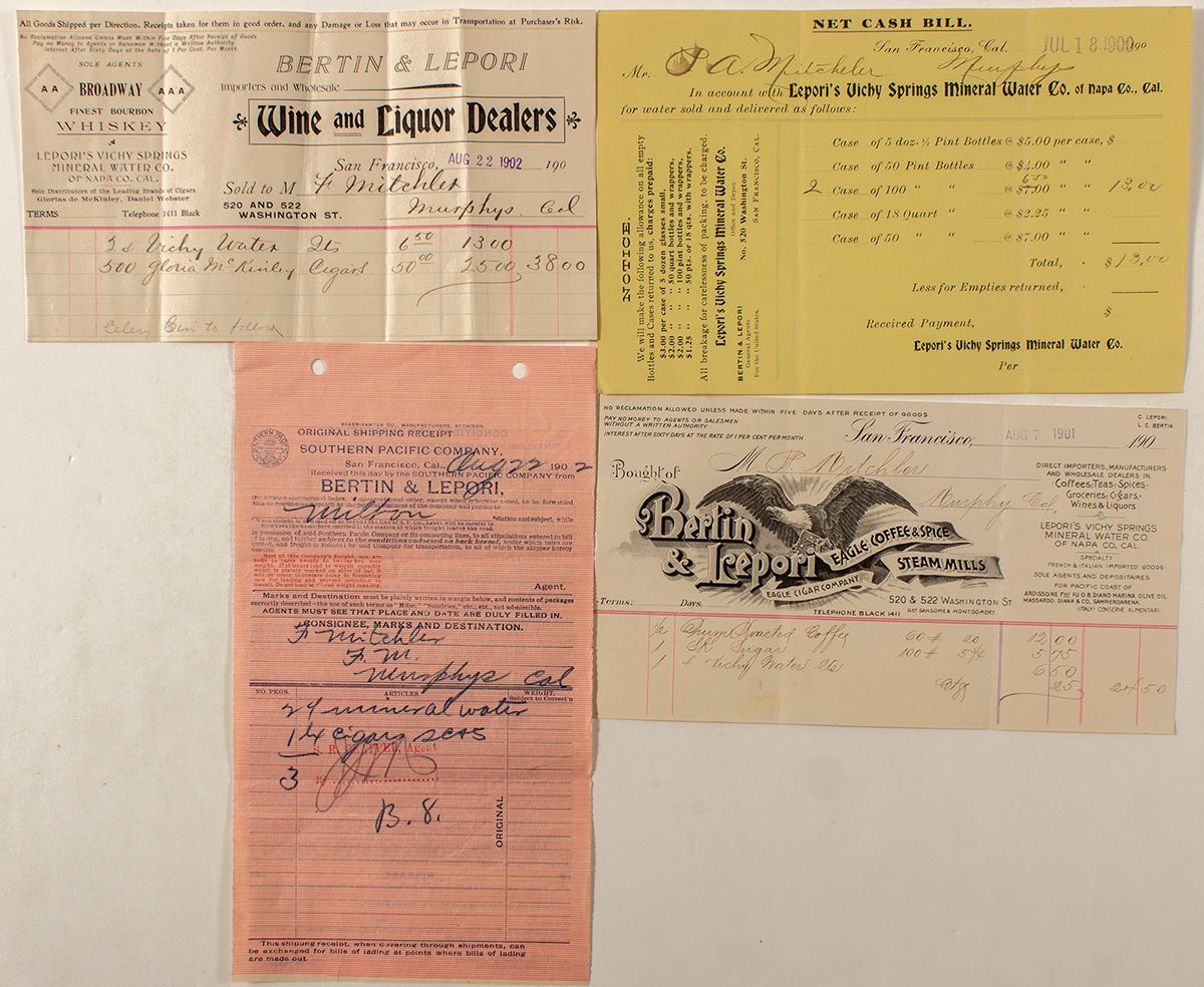 1) Billhead and SP shipping receipt both dated August 22, 1902. Bill is for Vichy Water (from Vichy Springs, Napa County) and 500 Gloria McKinley cigars. 2) 1901 Screaming Eagle pictorial. 3) Lepori's Vichy Springs Mineral Water billhead on yellow paper. 1900.City: San FranciscoCounty: San FranciscoState: CADate: