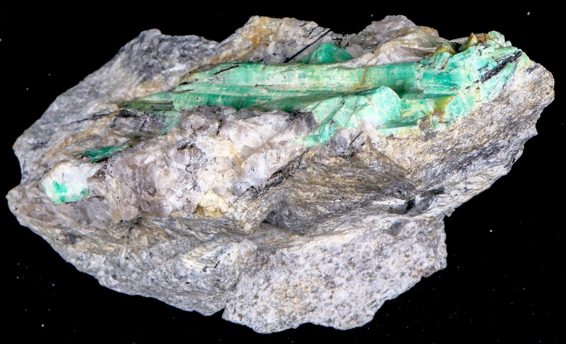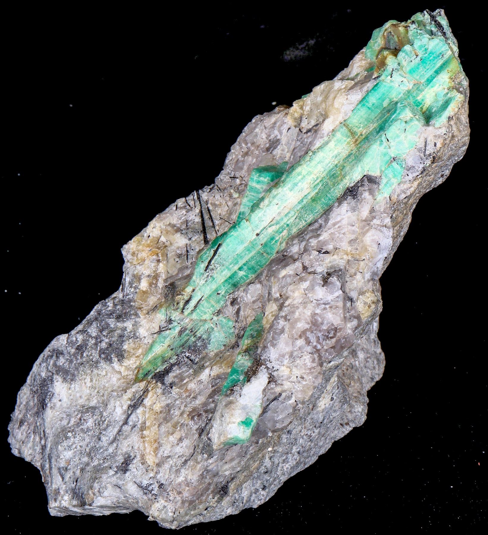 Comes in its own brocade box measuring 6 x 5 x 4.5" Specimen has large beryl crystals 1-4" with thin tourmaline needles on matrix with sulfide crystals. Specimen measures 6 x 3 x 3.5" State: City: Date: Provenance: Chunlin Zhu Collection