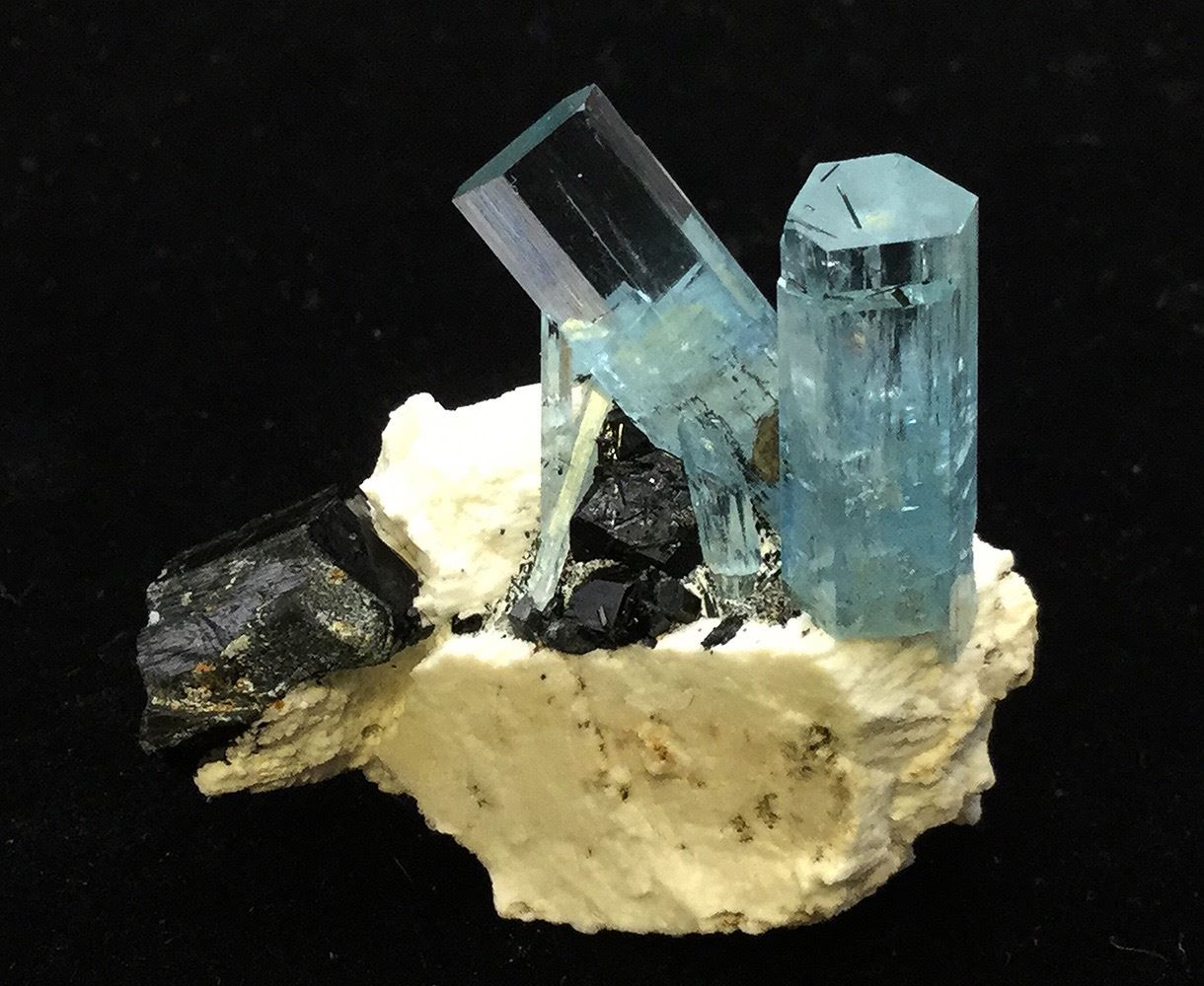 A little jewel of a specimen! The piece features two highly lustrous, gem-clear, light blue aquamarine crystals associated with black "schorl" tourmaline on a matrix of off-white feldspar. This specimen was recovered from the extensive gem-bearing pegmatite deposits in and around Erongo Mountain, Namibia. Dimensions (cm): 3 H x 3.1 W x 2 D. Location: Erongo Mountain, Usakos & Omaruru District, Namibia City: State: Namibia Date: HWAC# 53119