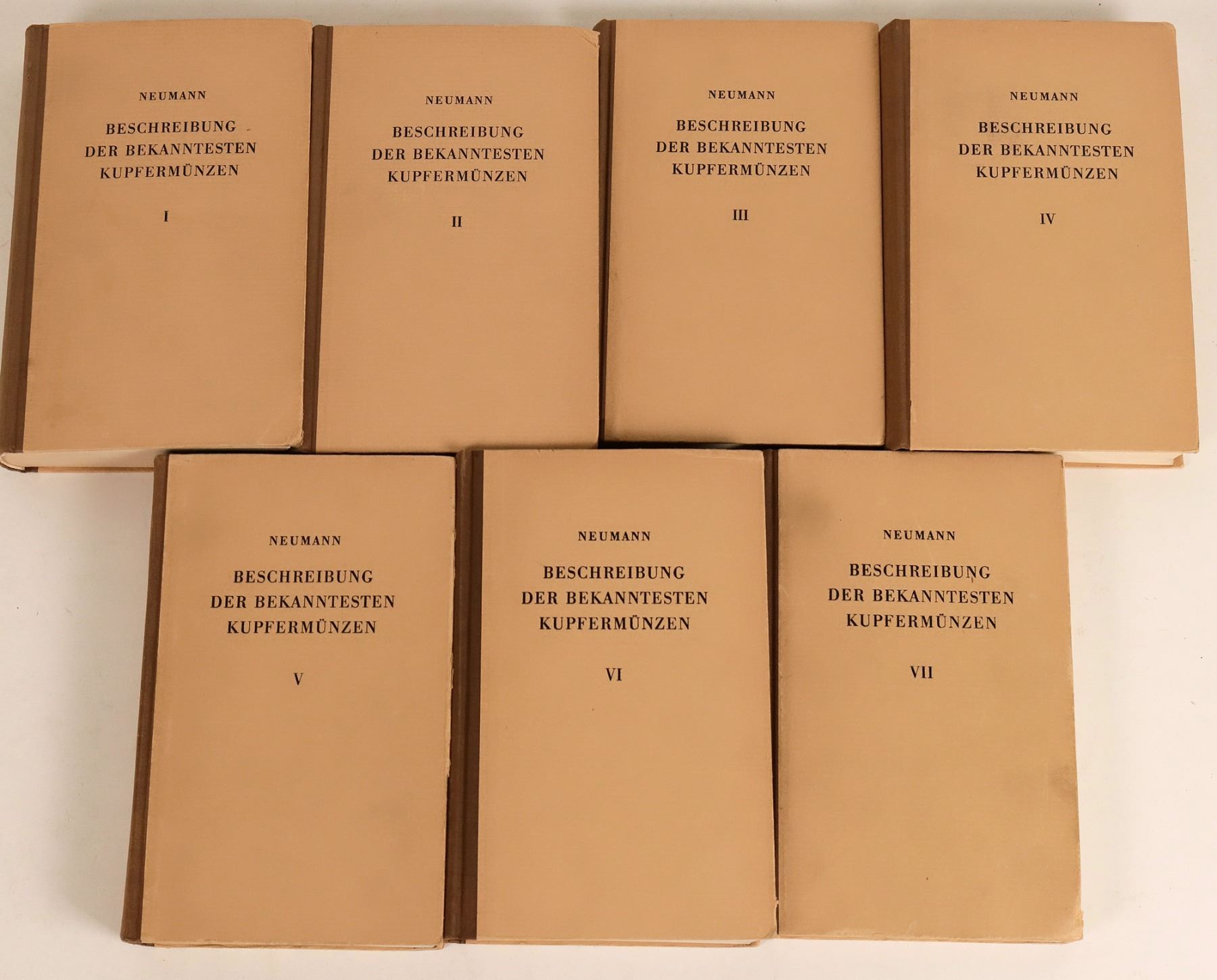 Volumes one through seven of the book, "Beschreibung Der Bekanntesten Kupfermunzen," by Josef Neumann, written in German. Facsimile reprint of the first edition of 1858, first reprinting, 1965, Johnson Reprint Corporation, New York. Each volume 200 to over 500 pages, with many pages of illustrations of tokens, etc., in the back. Spines intact, with some wear around the edges, but in very good condition.