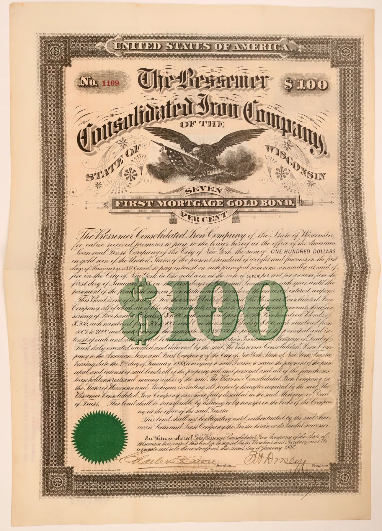 7%, 1st mortgage gold bond issued in 1888. Inc. in Wisconsin. Seventeen coupons attached at the right on this $100 bond. In 1887, the company gained control of the Iron King mine in the Gogebic range in Michigan, and the other Burton group of mines (Mines and Mineral Statistics, 1887). The bond is in VF condition and is uncancelled.