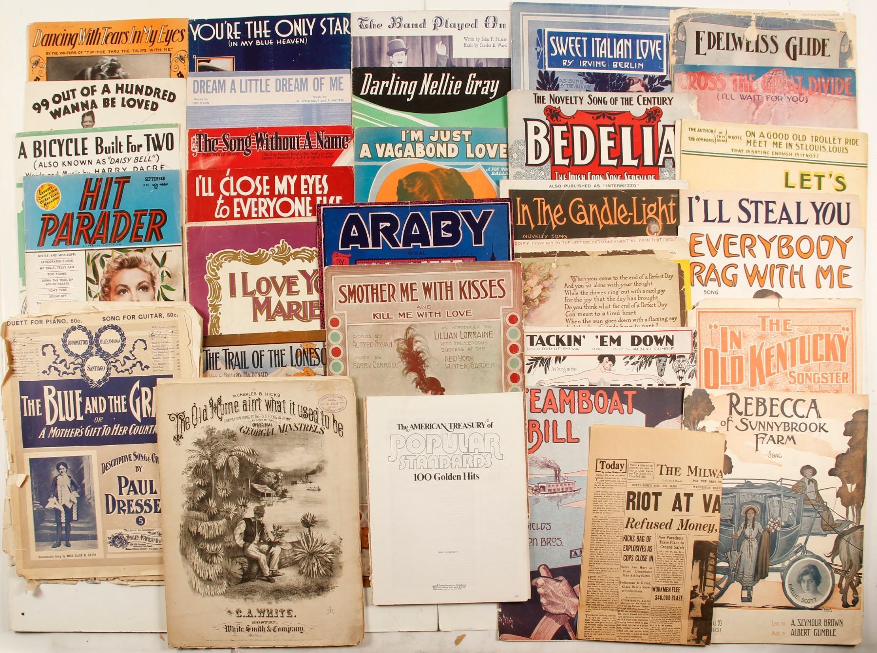 Misc. Sheet Music includes The Old Home Ain't What it Used to Be; Your'e the Only Star (In My Blue Heaven) Words & Music by Gene Autry; Dancing with Tears in My Eyes by Rudy Vallee; Dream a Little Dream of Me, by recorded by Frankie Laine; The Song Without a Name, only to list a few in this lot of approx. 30.